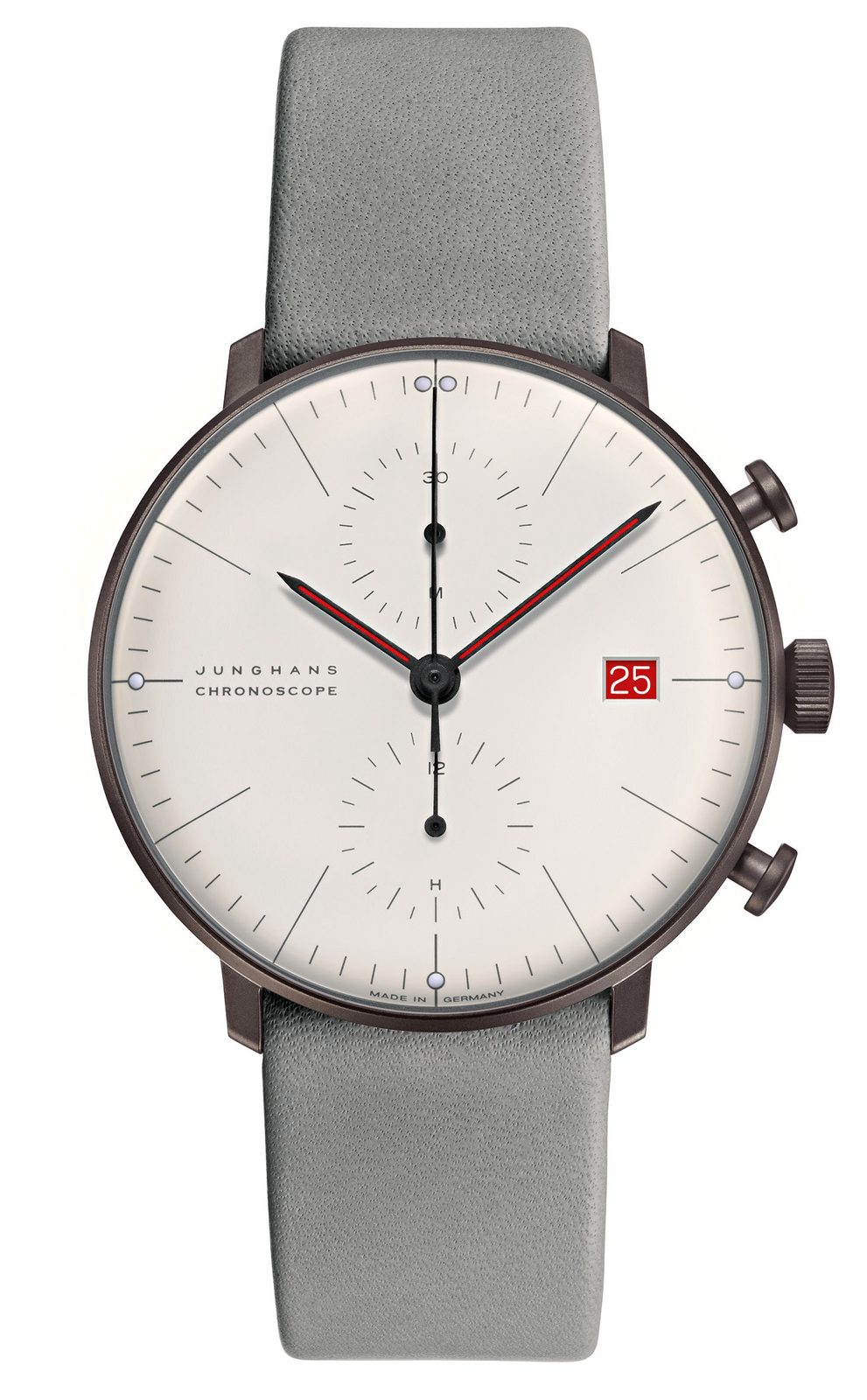 Německé hodinky Junghans Max Bill Chronoscope 100 Jahre Bauhaus 027/4902.02 z řady Max Bill jsou oblíbené pro svůj čistý, nadčasový vzhled inspirovaný uměleckým stylem Bauhaus. Tento model byl vytvořen na počest výročí 100 let od založení umělecké akademie Bauhaus ve Výmaru. Unikátní kousek, oslavující toto významné výročí, byl vyroben v limitované edici 1000 ks pro celý svět.