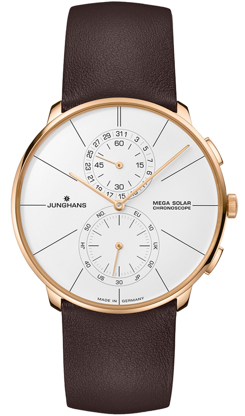 Německé hodinky Junghans Meister Fein Chronoscope Mega Solar 59/7201.00 z řady Meister nesou odkaz z první poloviny 20. století, jelikož mezi 30. a 60. lety minulého století byly v podobném stylu vyráběny hodinky navrhnuté tehdejším návrhářem Antonem Zieglerem. Zároveň přináší dotek moderní hodinářské technologie v podobě rádiem řízeného strojku. Tento model rozhodně patří k nejelegantnějším rádiem řízeným hodinkám na světě, navíc se solárním pohonem.