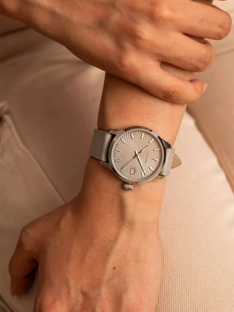 Pouzdro hodinek Junkers Victoria 970.02.08 je vyrobeno z ušlechtilé oceli a hodinky na ruce drží díky koženému řemínku šedé barvy se stříbrnou trnovou sponou.