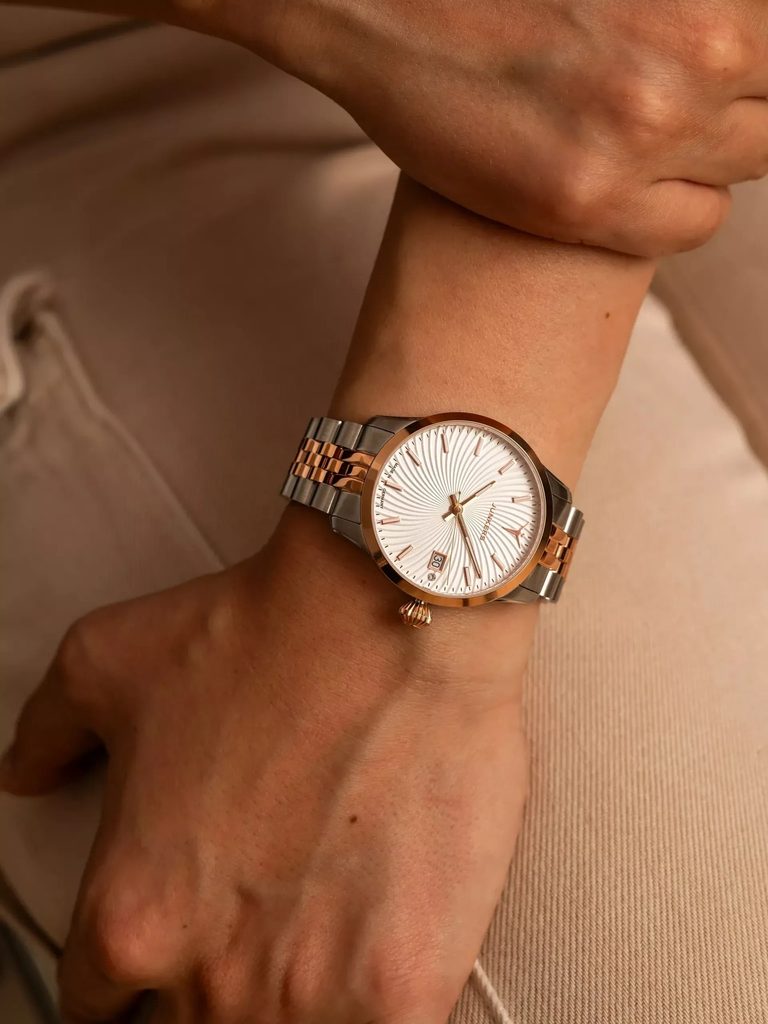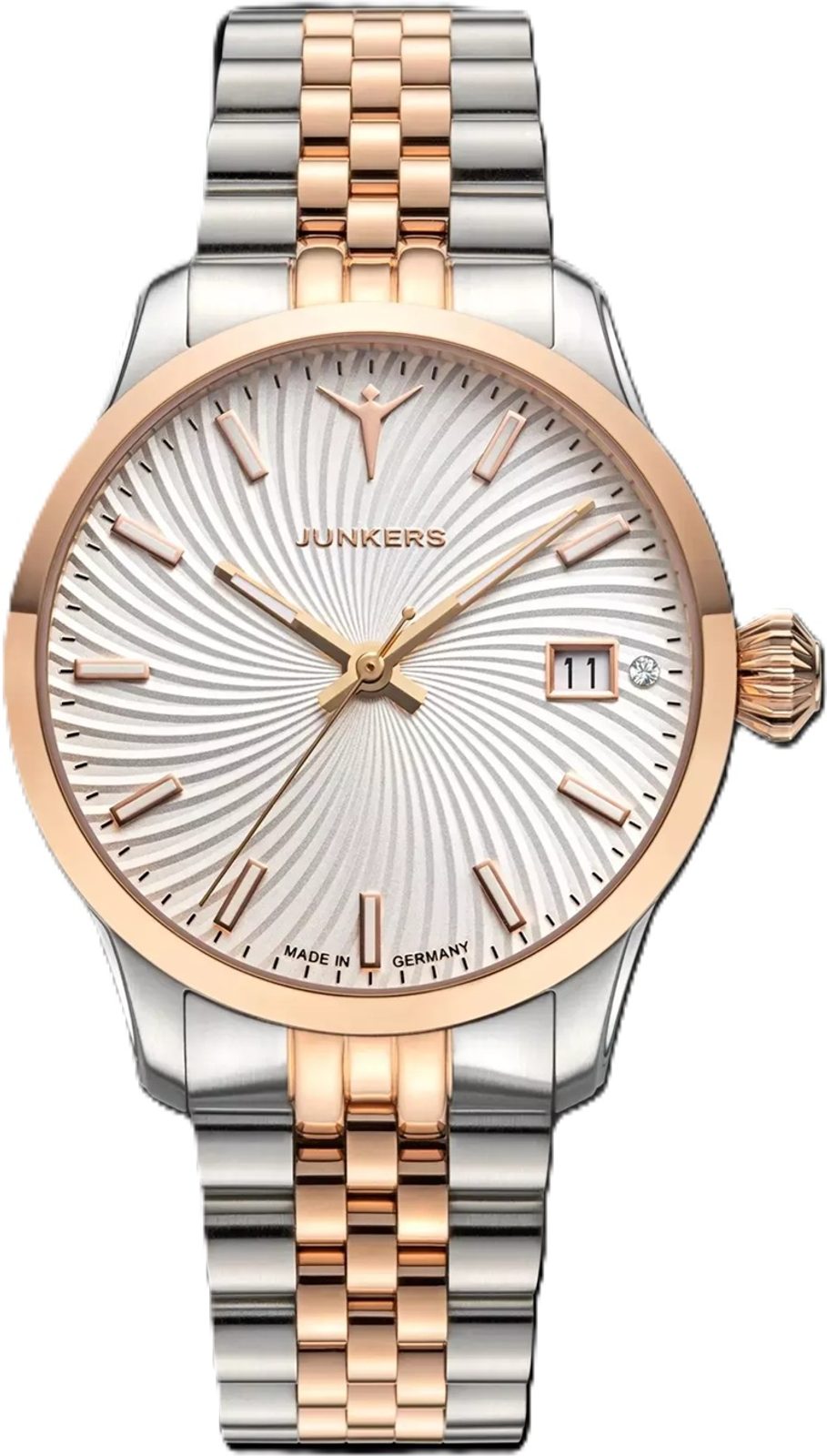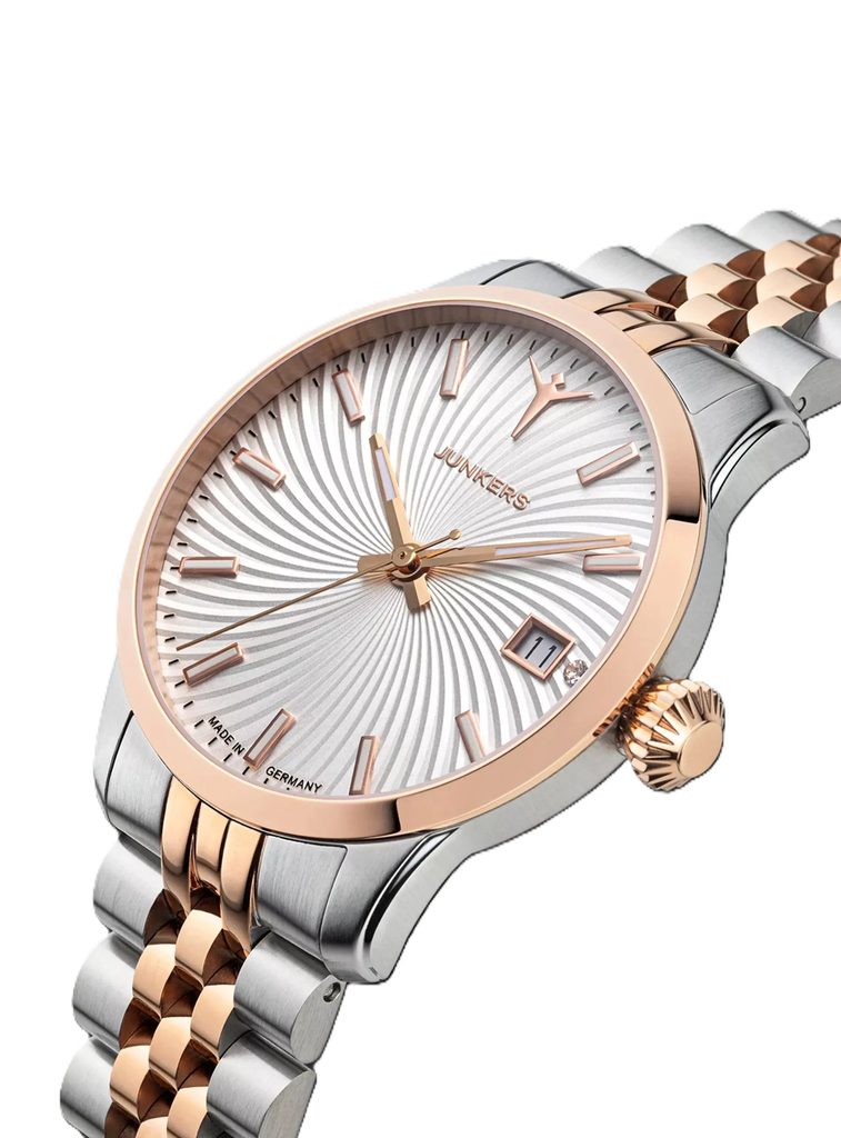 Pouzdro hodinek Junkers Victoria 970.62.33M je vyrobeno z ušlechtilé oceli a hodinky na ruce drží díky ocelovému náramku s překlápěcí sponou. Jak náramek tak pouzdro mají provedení bicolor, tedy kombinace stříbrné a růžového zlata.