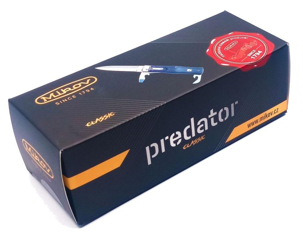 Predator Klasik je automatický vyhazovací nůž pyšnící se originálním designem a kvalitními materiály. Čepel nože je vyrobena z nerezové oceli 420 o tvrdosti 53-55 HRc, pro kterou je charakteristická vysoká odolnost a spolehlivost. Pozornost upoutá také dokonale ergonomická střenka z odolného plastu. Součástí nože je čepel, otvírák lahví, který plní také funkci plochého šroubováku a ovtírák konzerv.