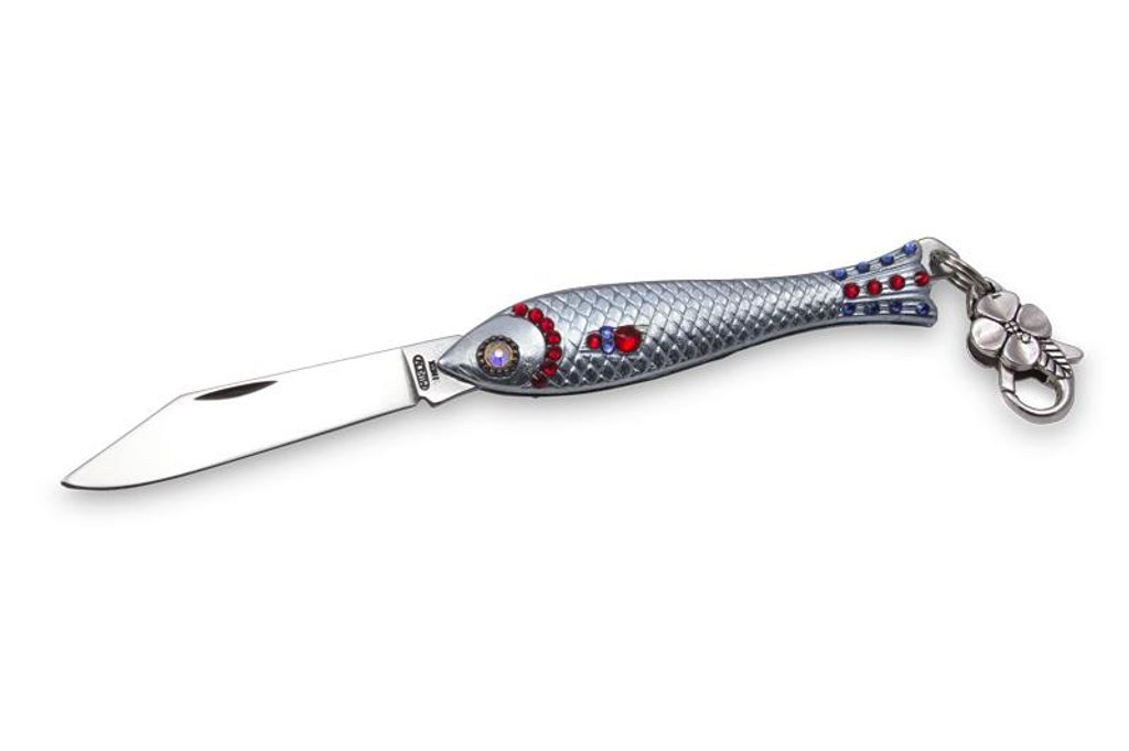 Dione je legendární kapesní nůž Rybička ručně zdobený kamínky Preciosa. Hodí se proto jako dárek k nejrůznějším příležitostem. Zatímco čepel nože je vyrobena z nerezové oceli 420 o tvrdosti 52-55 HRc, střenka je ze zinkové slitiny. Nůž je navíc opatřen dekorativní karabinkou.
