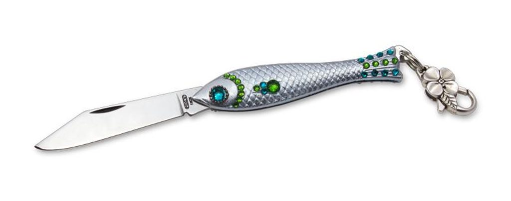 Melia je legendární kapesní nůž Rybička ručně zdobený kamínky Preciosa. Hodí se proto jako dárek k nejrůznějším příležitostem. Zatímco čepel nože je vyrobena z nerezové oceli 420 o tvrdosti 52-55 HRc, střenka je ze zinkové slitiny. Nůž je navíc opatřen dekorativní karabinkou.