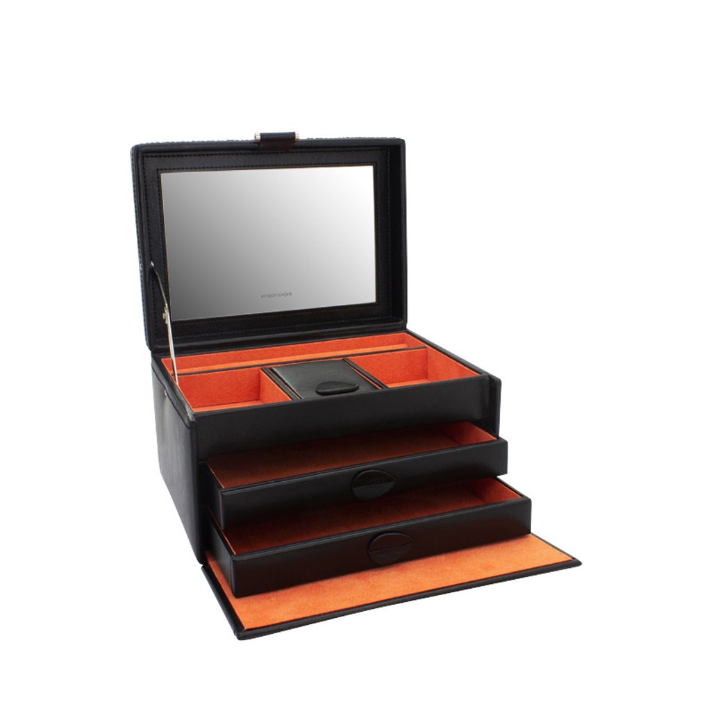 Obsahuje 3 patra pro uložení různých typů šperků, zrcátko najdeme ve víku šperkovnice. Pod víkem je prostor pro prsteny a další dvě přihrádky s polštářky pro vetší šperky. Ve spodní části jsou 2 další šuplíky.