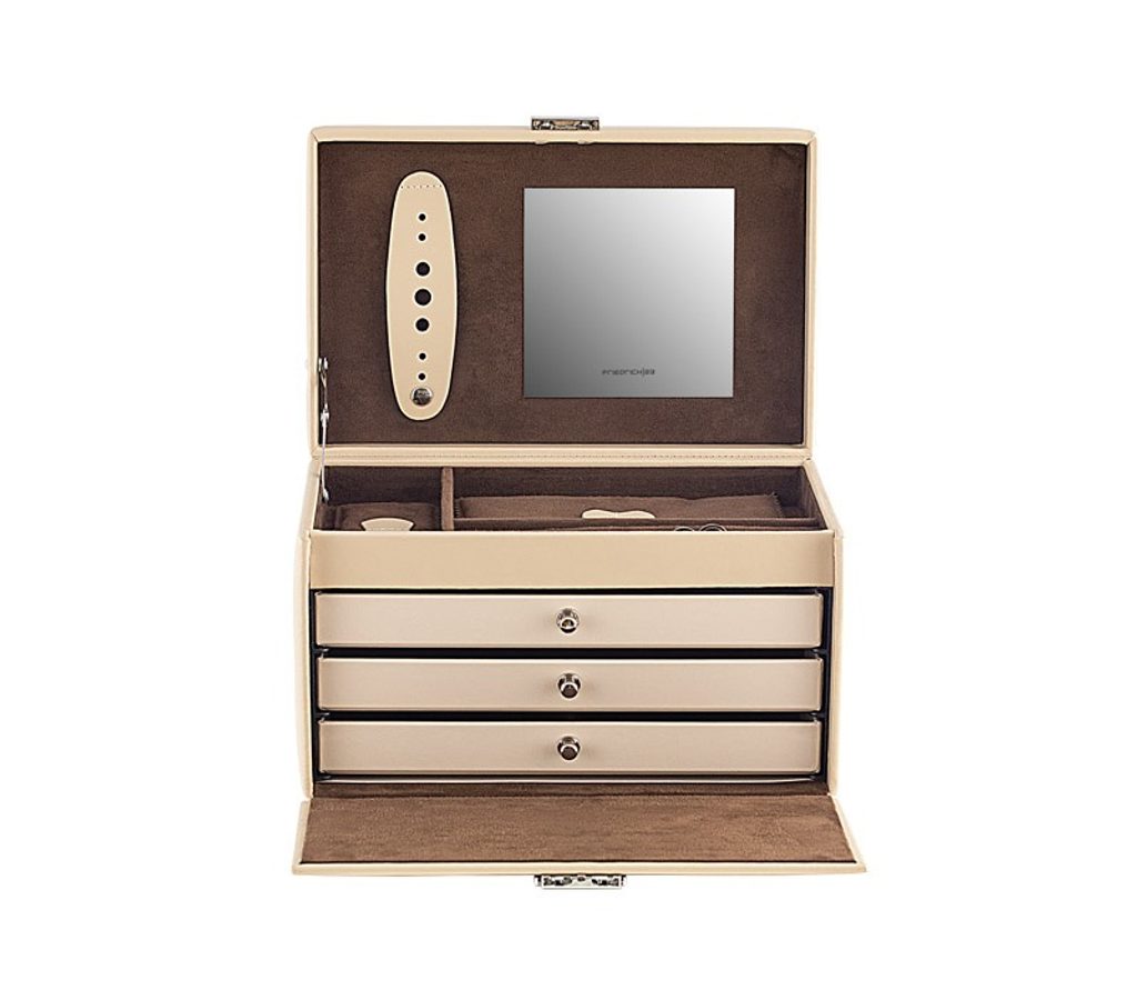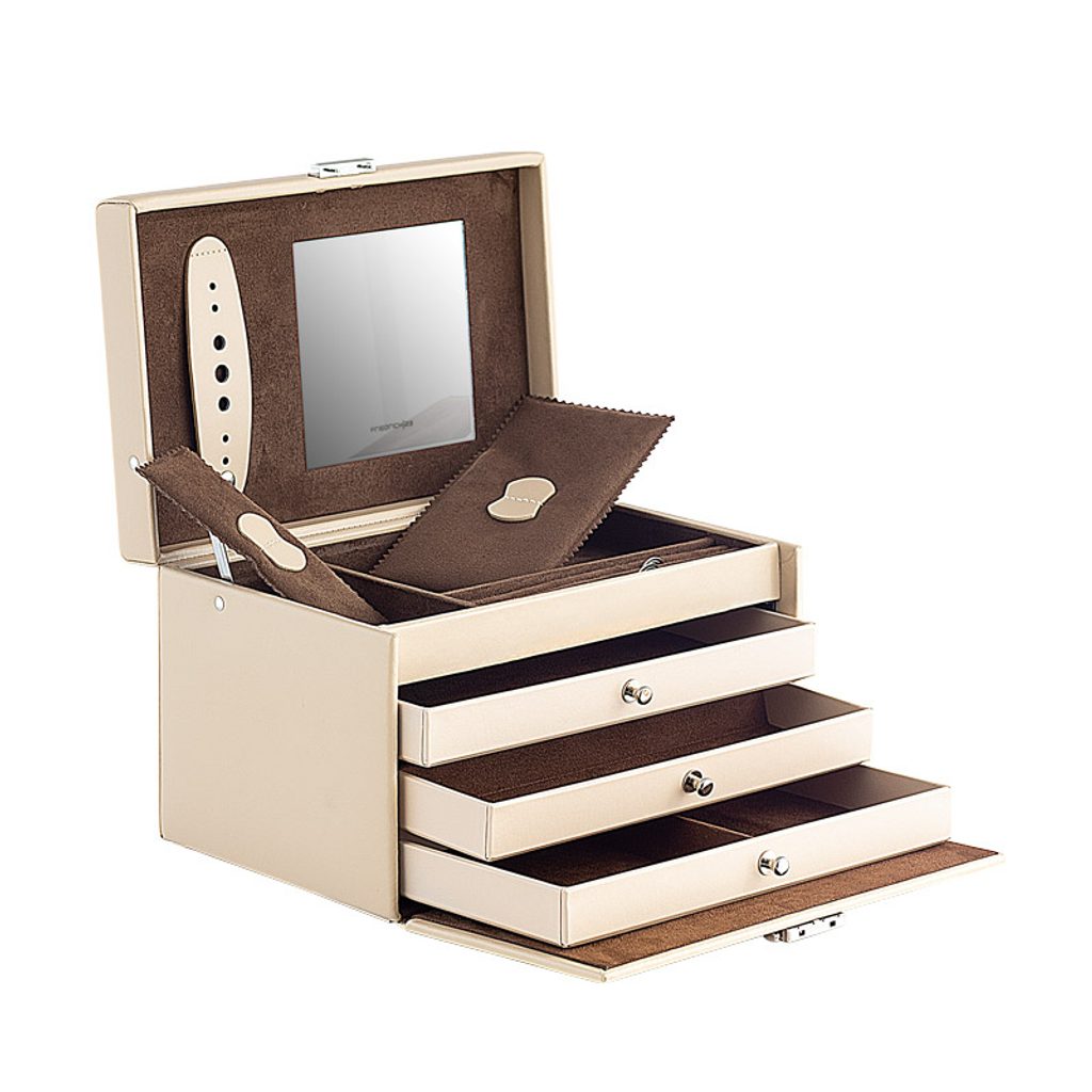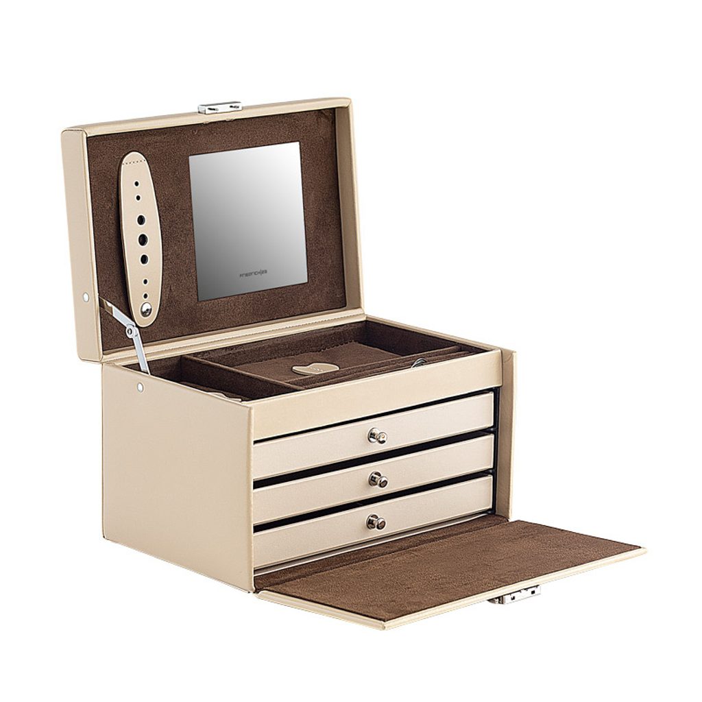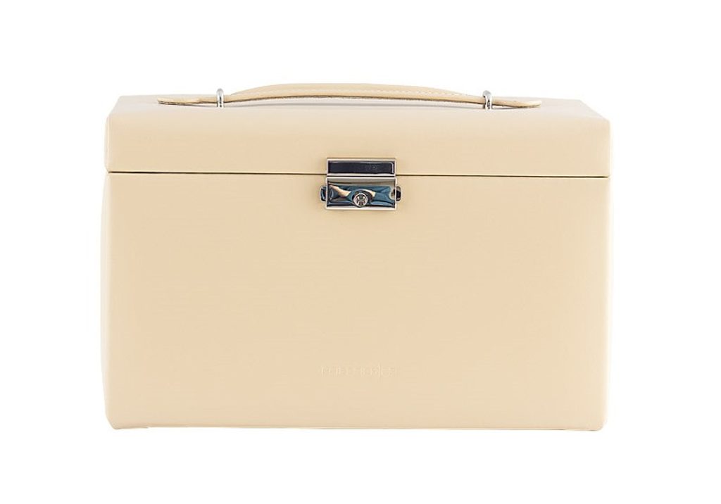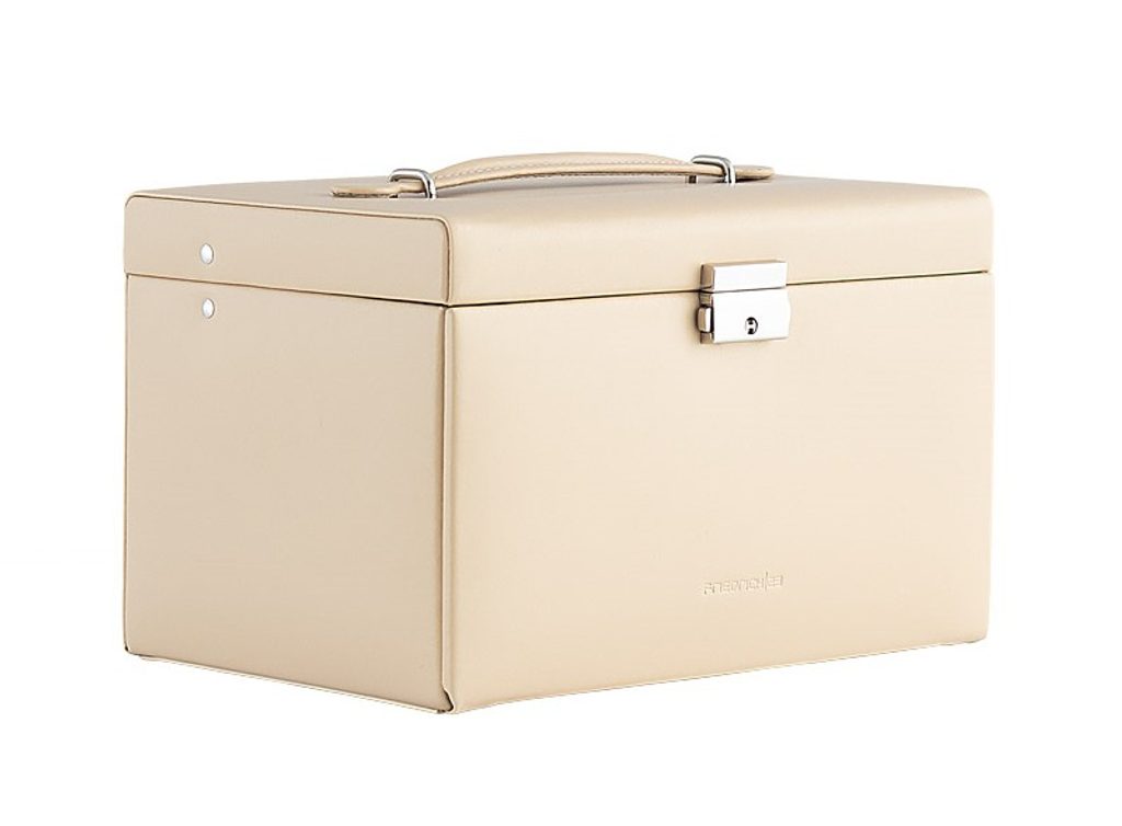 Šperkovnice Friedrich Lederwaren Cordoba 26217-8 béžové barvy je potažena kůží. Obsahuje 4 patra pro uložení různých typů šperků, zrcátko ve víku šperkovnice.