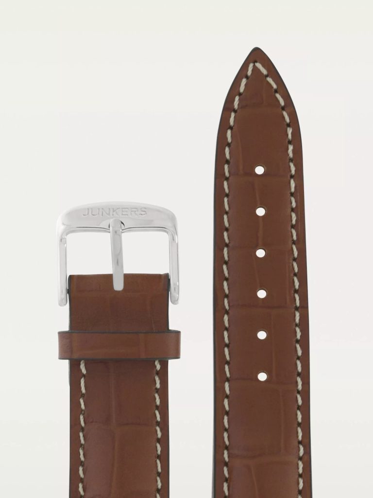 Originální Junkers řemínek hnědé barvy v šířce 20 mm se vzorem krokodýlí kůže a stříbrnou trnovou sponou.