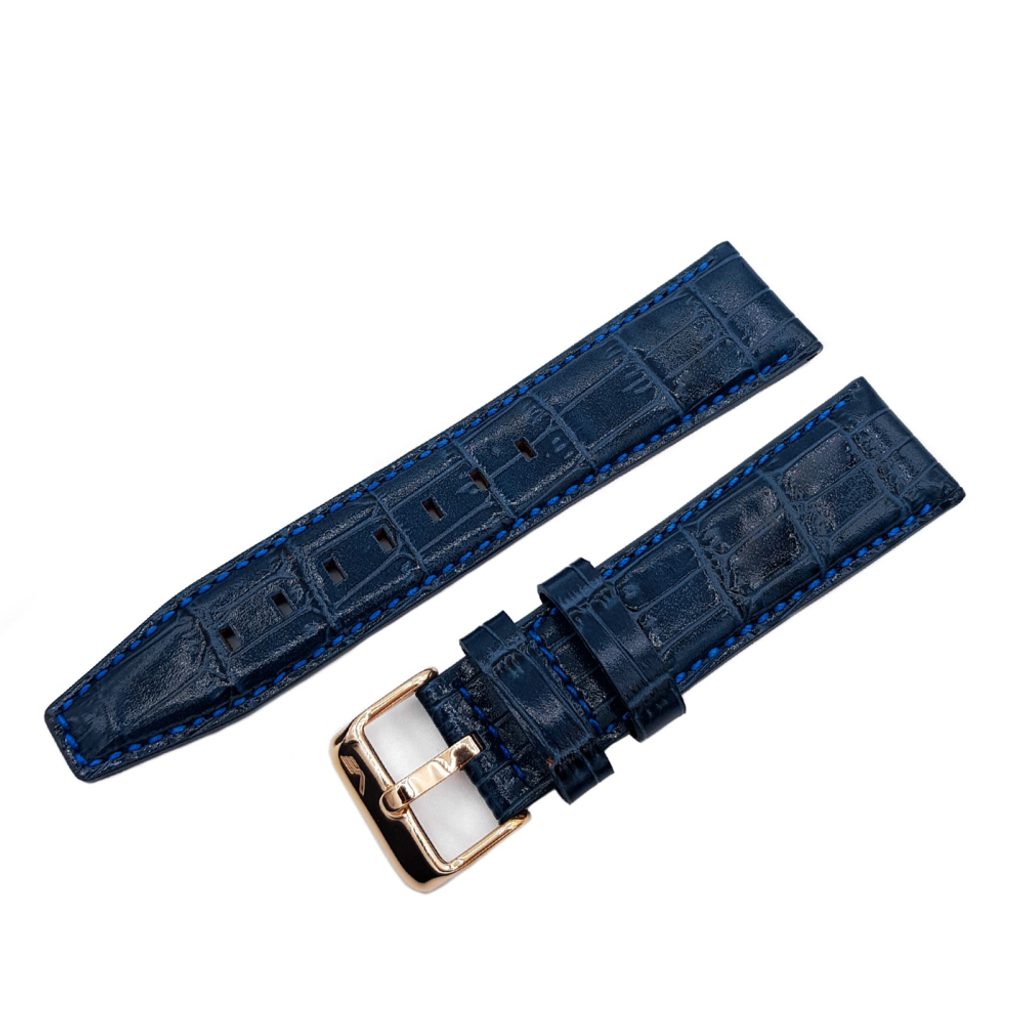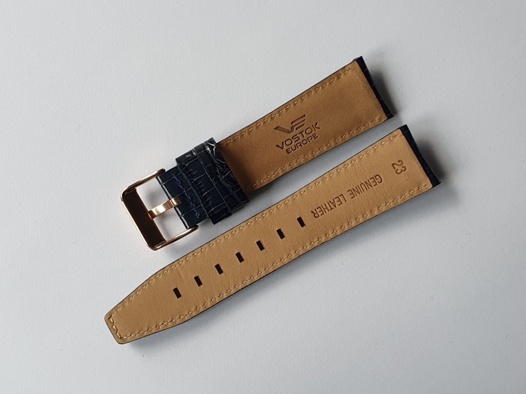 Originální kožený řemínek Vostok Europe je určený pro model GAZ 14 Limousine 6S21-565B596. Řemínek je vyroben v designu vzoru krokodýlí kůže v šířce 23 mm, se zlatou sponou a modrým prošitím.