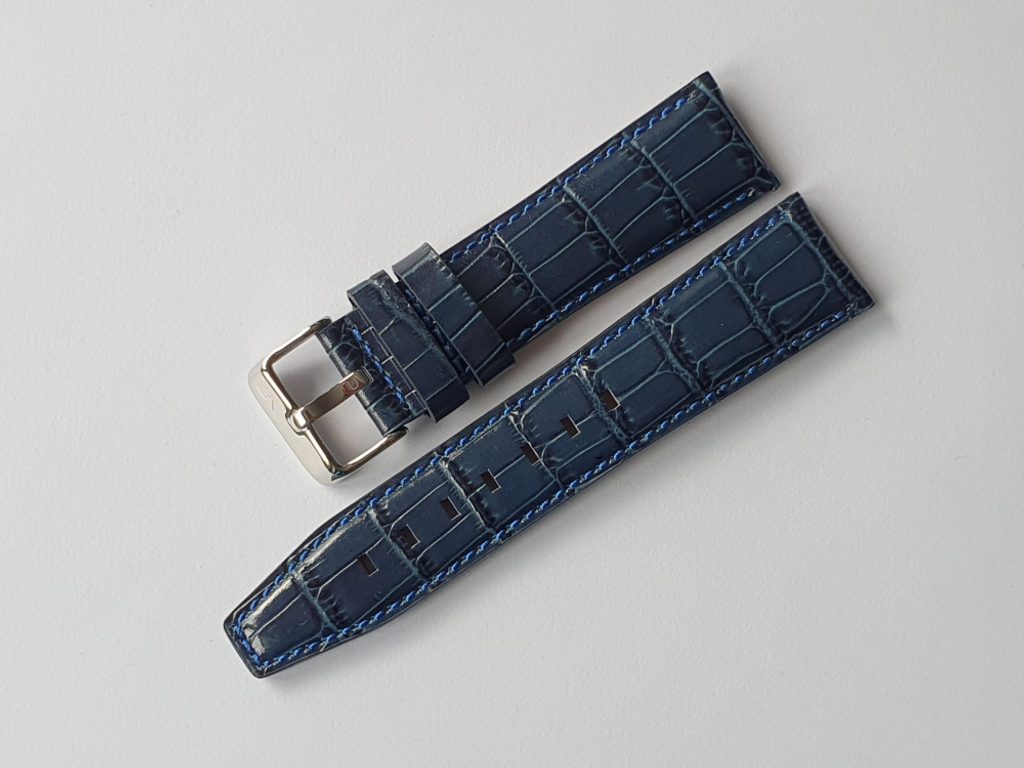 Originální kožený řemínek Vostok Europe je určený pro model GAZ 14 Limousine NH35-565A594. Řemínek je vyroben v designu vzoru krokodýlí kůže v šířce 23 mm, s lesklou sponou a modrým prošitím.