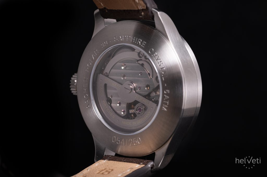 Ocelové pouzdro hodinek Laco Flieger Aachen 39 doplňuje hnědý kožený řemínek s kontrastním světlým prošitím a výraznými nýty. Poháněny jsou mechanickým strojkem s automatickým nátahem Laco 2S (základ Miyota 82S0), nabízejícím rezervou chodu kolem 42 hodin, funkci zastavení vteřinovky při nařizování času (hacking) a možnost manuálního nátahu. Mnohé potěší možnost pozorovat chod stroje skrze průhledné dýnko opatřené safírovým sklíčkem. Voděodolnost těchto hodinek je 50 m (5 ATM). Průměr pouzdra je 39 mm, délka (lug-to-lug) 46,5 mm, hodinky tak dobře sednou na většinu pánských, ale i mnohá dámská zápěstí.
