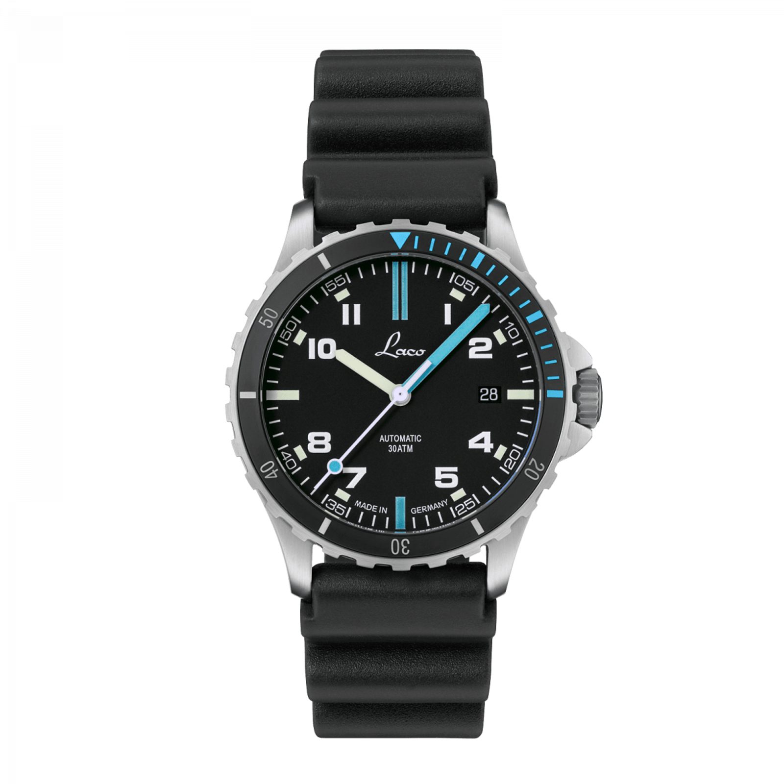 Laco Atlantik 39 z řady Squad se vyznačují robustním avšak kompaktním pouzdrem a přehledným designem. Ocelové pouzdro hodinek doplňuje černý pryžový řemínek zakončený trnovou sponou. Hodinky jsou vybavené jednosměrně otočnou potápěčskou lunetou s keramickou vložkou s minutovým značením. Černý číselník, zvýrazněný modrými prvky, vyniká skvělou přehledností a čitelností, která je při zhoršených světelných podmínkách podpořena luminiscencí na ručkách a indexech. Ochranu mu zajišťuje vypouklé safírové sklíčko s vnitřním antireflexem, snižujícím odlesky a zajišťujícím tak dobrou čitelnost na přímém světle.