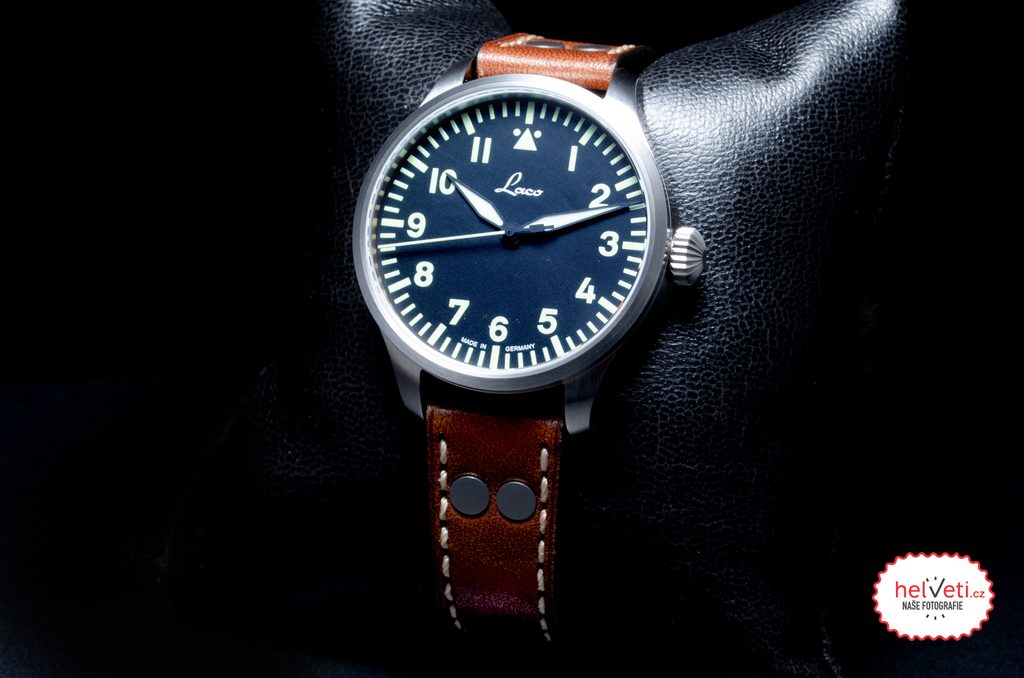 Ocelové pouzdro hodinek Laco Flieger Augsburg 39 doplňuje hnědý kožený řemínek s kontrastním bílým prošitím a výraznými nýty. Poháněny jsou mechanickým strojkem s automatickým nátahem Laco 2S (základ Miyota 82S0), nabízejícím rezervou chodu kolem 42 hodin, funkci zastavení vteřinovky při nařizování času (hacking) a možnost manuálního nátahu. Mnohé potěší možnost pozorovat chod stroje skrze průhledné dýnko opatřené safírovým sklíčkem. Voděodolnost těchto hodinek je 50 m (5 ATM), zvládnou tedy kontakt s vodou při mytí rukou a dešti. Průměr pouzdra je 39 mm, délka (lug-to-lug) 46,5 mm, hodinky tak dobře sednou na většinu pánských zápěstí.