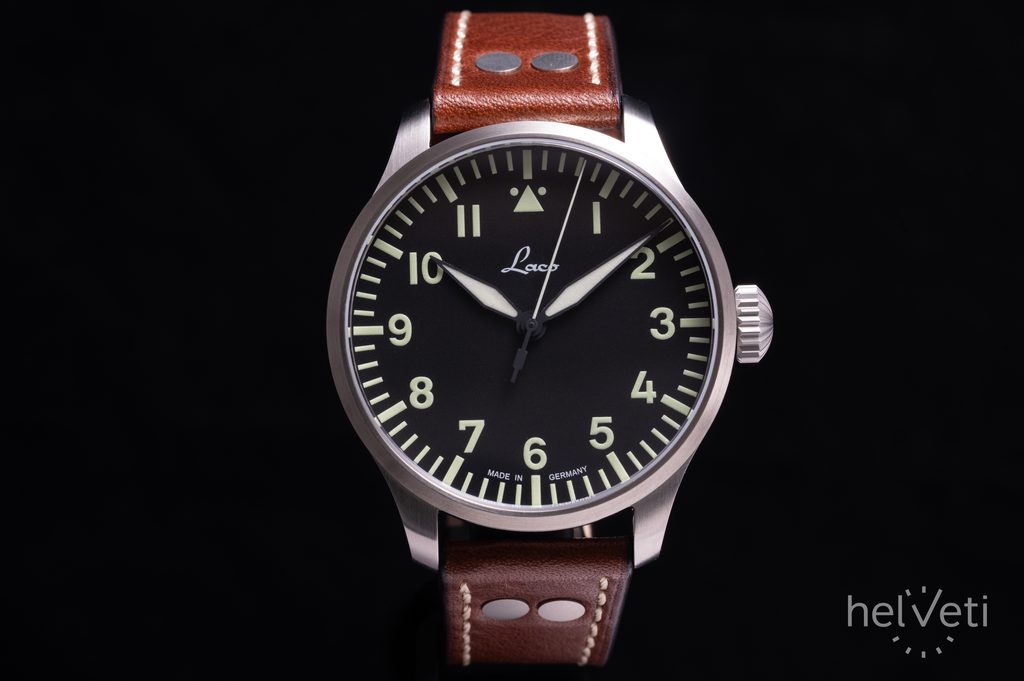 Ke klasickým poznávacím znakům hodinek Laco Augsburg 42, inspirujících se leteckým stylem, patří výrazné a dobře čitelné ručky a indexy na hodinových pozicích, výrazná cibulovitá korunka, která se snadno ovládá i v rukavicích. Dokonale přehledný číselník typu A je chráněn safírovým sklíčkem s vysokou odolností proti poškrábání. Lepší čitelnost při zhoršených světelných podmínkách zajišťuje luminiscence, umístěná na ručkách, číslicích a indexech.