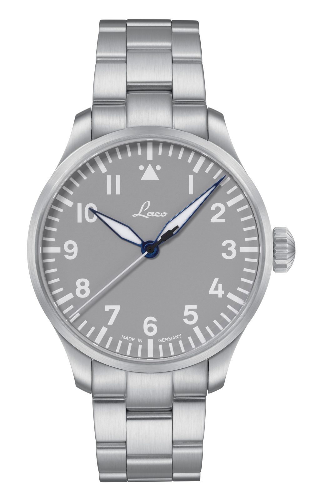 Ke klasickým poznávacím znakům hodinek Laco Augsburg Grau 42 MB, inspirujících se leteckým stylem, patří výrazné a dobře čitelné ručky a indexy na hodinových pozicích, dobře ovladatelná korunka. Dokonale přehledný číselník typu A je chráněn safírovým sklíčkem s vysokou odolností proti poškrábání. Lepší čitelnost při zhoršených světelných podmínkách zajišťuje luminiscence, umístěná na ručkách, číslicích a indexech. Ručky hodinek jsou teprve podruhé (po modelech Laco Polar) v této sérii tepelně modřené.