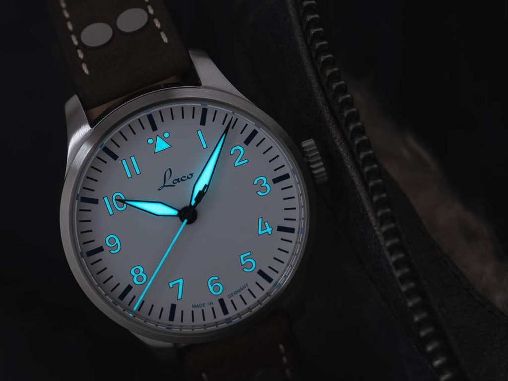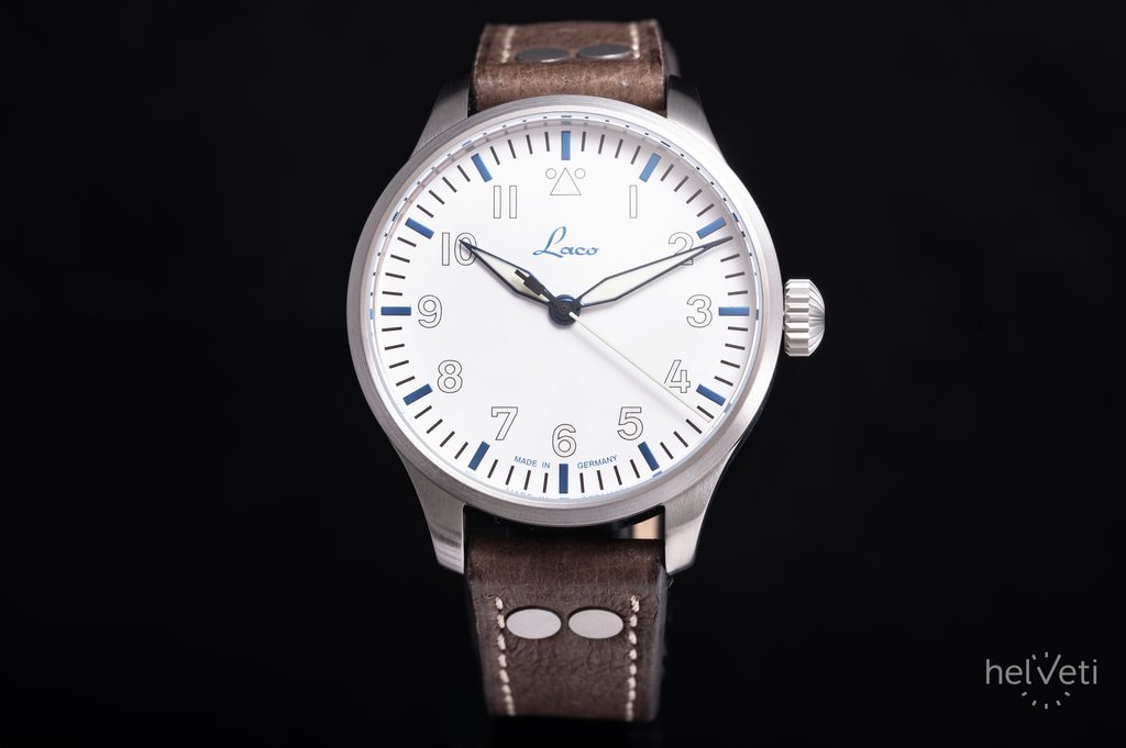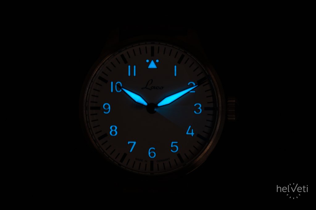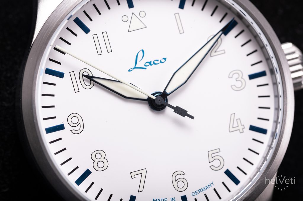 Ke klasickým poznávacím znakům hodinek Laco Augsburg Polar 39, inspirujících se leteckým stylem, patří výrazné a dobře čitelné ručky a indexy na hodinových pozicích, velká korunka, která se snadno ovládá i v rukavicích. Dokonale přehledný číselník typu A je chráněn safírovým sklíčkem s vysokou odolností proti poškrábání. Lepší čitelnost při zhoršených světelných podmínkách zajišťuje luminiscence Superluminova C3 Blue Line, umístěná na ručkách, číslicích a indexech. Ručky hodinek jsou tepelně modřené.