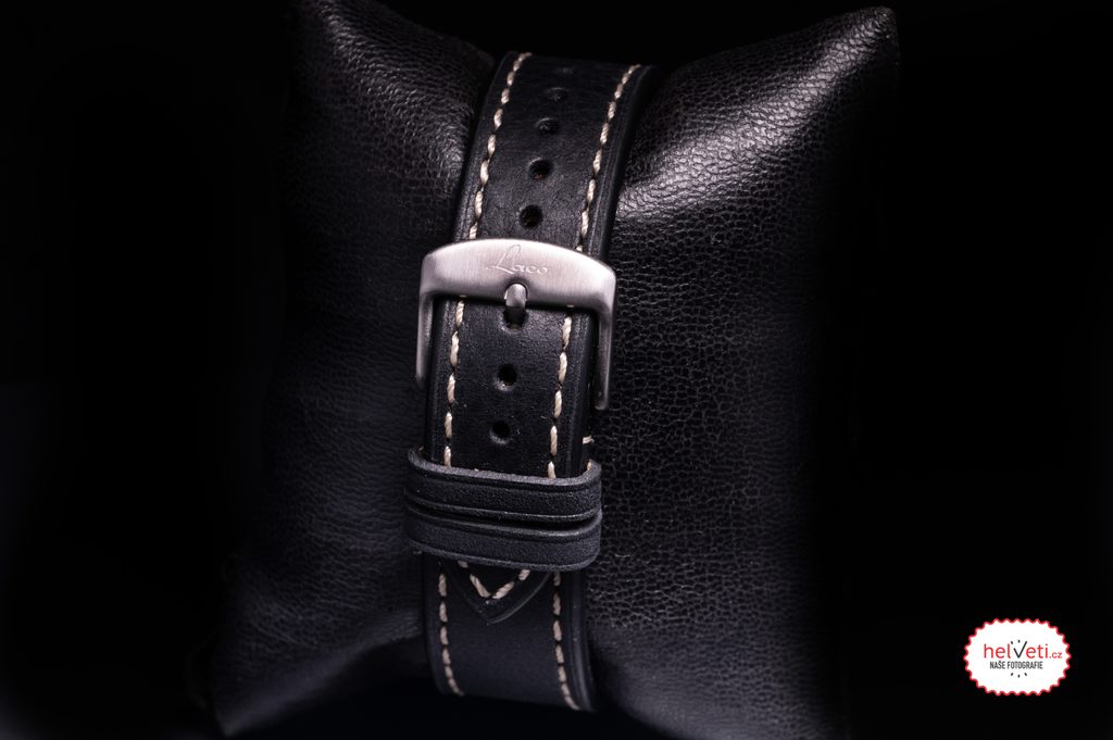 Ocelové pouzdro hodinek Laco Flieger Bielefeld 42 s černou úpravou povrchu doplňuje černý kožený řemínek s kontrastním bílým prošitím a výraznými nýty. Poháněny jsou mechanickým strojkem s automatickým nátahem Laco 2S (základ Miyota 82S0), nabízejícím rezervou chodu kolem 42 hodin, funkci zastavení vteřinovky při nařizování času (hacking) a možnost manuálního nátahu. Mnohé potěší možnost pozorovat chod stroje skrze průhledné dýnko opatřené safírovým sklíčkem. Voděodolnost těchto hodinek je 50 m (5 ATM), zvládnou tedy plavání. Průměr pouzdra je 42 mm, délka (lug-to-lug) 50 mm, hodinky tak dobře sednou na většinu pánských zápěstí.
