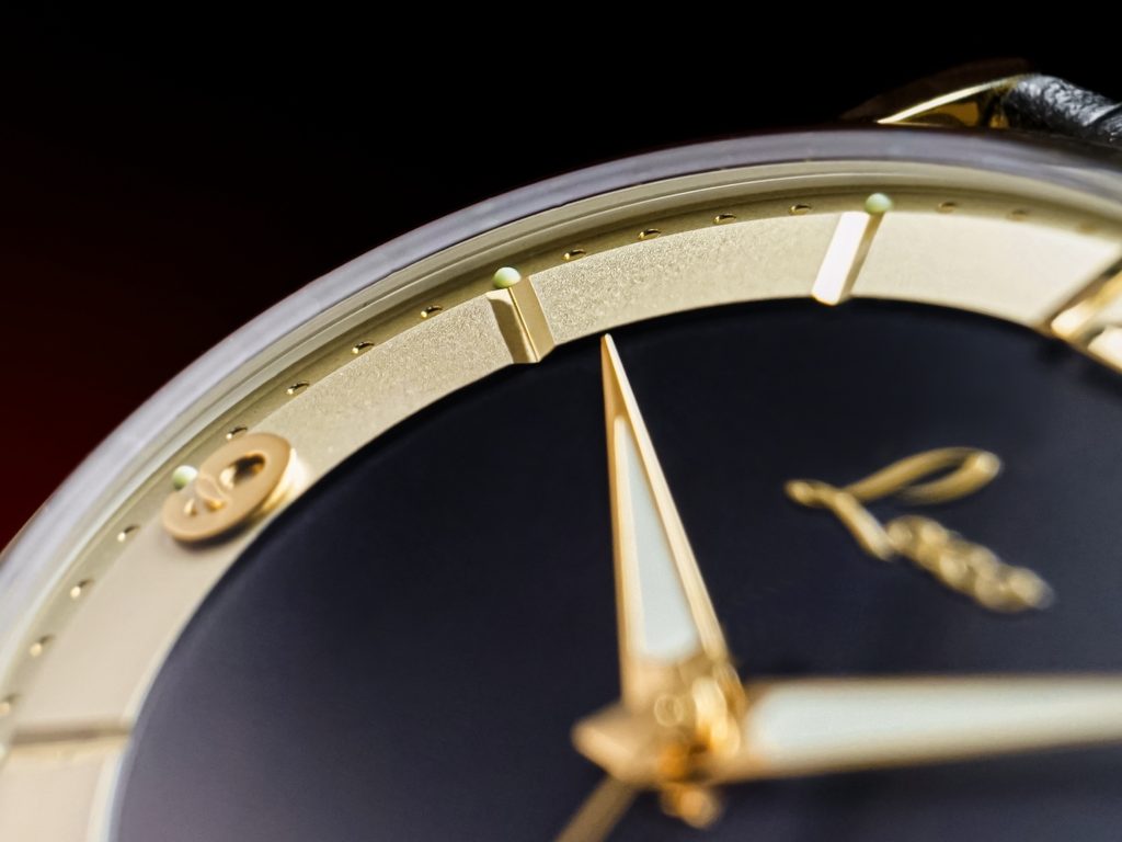 Číselník hodinek kombinuje matný černý střed s vnějším prstencem v barvě šampaň. Celkový dojem podtrhují aplikované zlaté číslice a indexy na hodinových pozicích, spolu s výraznými ručkami. Číselník a tím i velikost hodinek opticky zvětšuje použití pouzdra s velmi tenkou lunetou.