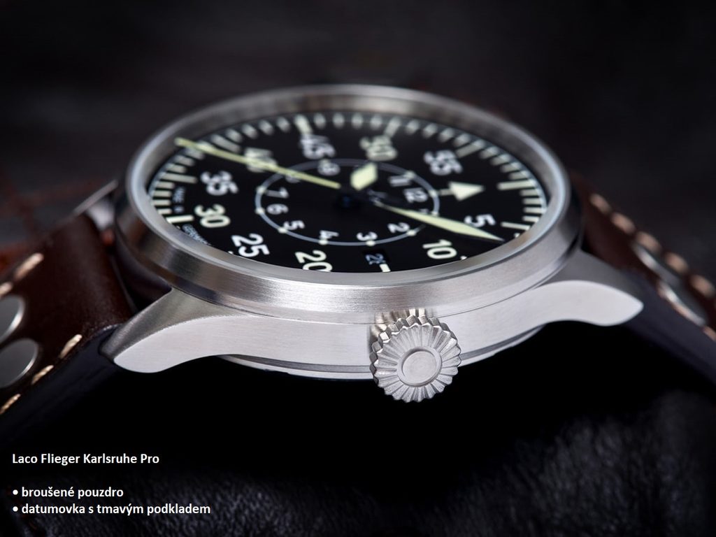 Ke klasickým poznávacím znakům pilotních hodinek Laco Karlsruhe Pro 37 Automatic patří výrazné a dobře čitelné ručky a indexy na hodinových pozicích a velká korunka, která se snadno ovládá i v rukavicích. Dokonale přehledný číselník typu B je chráněn klenutým safírovým sklíčkem s vnitřním antireflexem a vysokou odolností proti poškrábání. Číselník B-Uhr typ B se vyznačuje minutovou stupnicí tištěnou po obvodu číselníku, se šipkou na pozici 12. hodiny, která letcům sloužila pro rychlou orientaci a hodinovou škálou vytištěnou na vnitřní kružnici. Lepší čitelnost při zhoršených světelných podmínkách zajišťuje luminiscence, umístěná na ručkách, číslicích a indexech. Ručky hodinek jsou tepelně modřené.