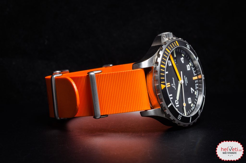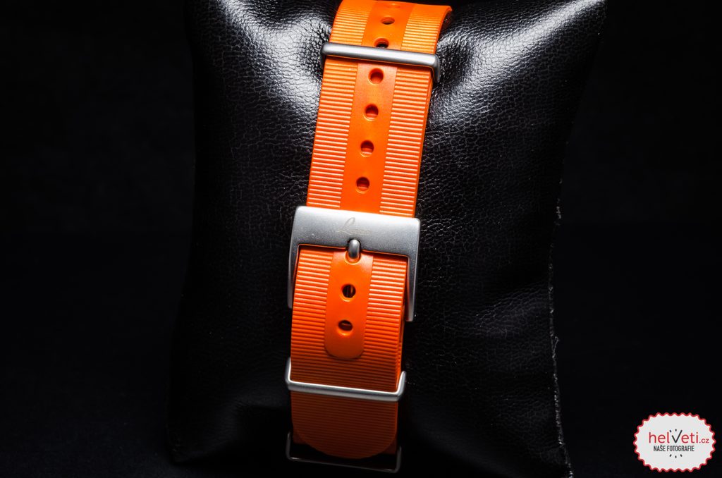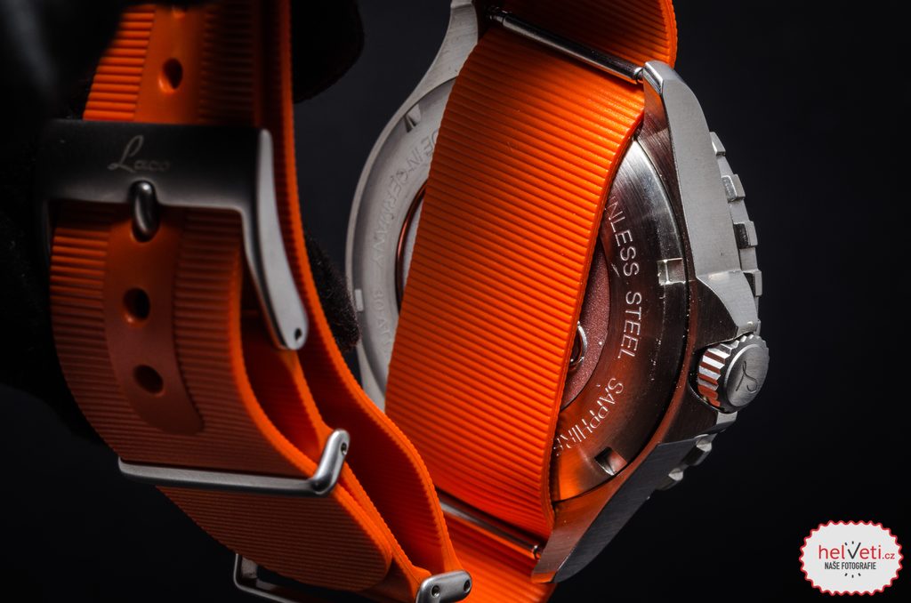 Laco Mojave 42 RB z řady Squad se vyznačují robustním avšak kompaktním pouzdrem a přehledným designem. Ocelové pouzdro hodinek doplňuje oranžový pryžový Nato řemínek zakončený trnovou sponou. Hodinky jsou vybavené jednosměrně otočnou potápěčskou lunetou s keramickou vložkou s minutovým značením. Černý číselník, zvýrazněný oranžovými prvky, vyniká skvělou přehledností a čitelností, která je při zhoršených světelných podmínkách podpořena luminiscencí na ručkách a indexech. Ochranu mu zajišťuje vypouklé safírové sklíčko s vnitřním antireflexem, snižujícím odlesky a zajišťujícím tak dobrou čitelnost na přímém světle.