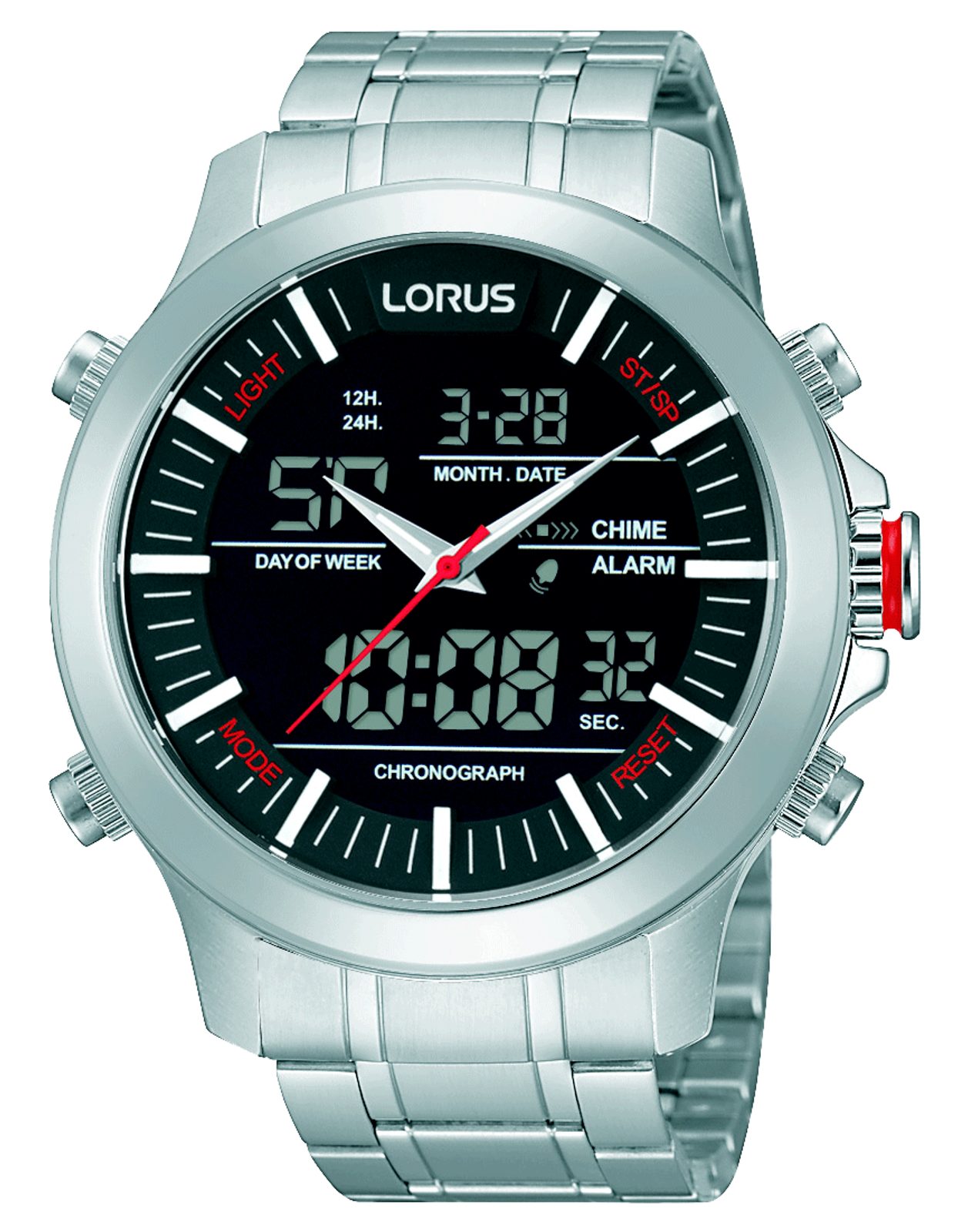 Pánské hodinky Lorus, značky firmy SEIKO. Model vhodný k běžnému nošení, či sportovním aktivitám, je vyroben v celoocelovém provedení. Černý ciferník, jenž kombinuje analogové a digitální zobrazení času, chrání minerální sklíčko. Vodotěsnost hodinek je 100M - vhodné pro běžné koupání. Z funkcí hodinek nabízí model Lorus RW601AX9 ukazatel data, stopky a budík. Hodinky disponují bateriovým strojkem quartz.