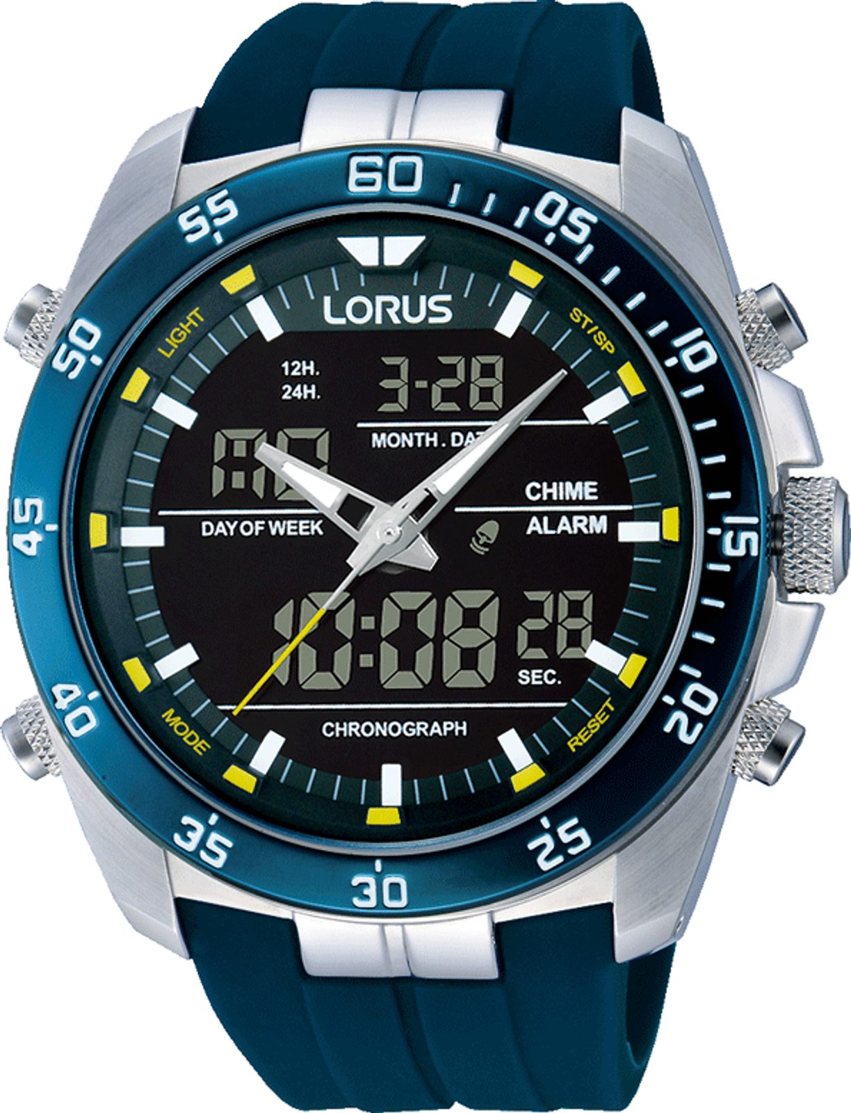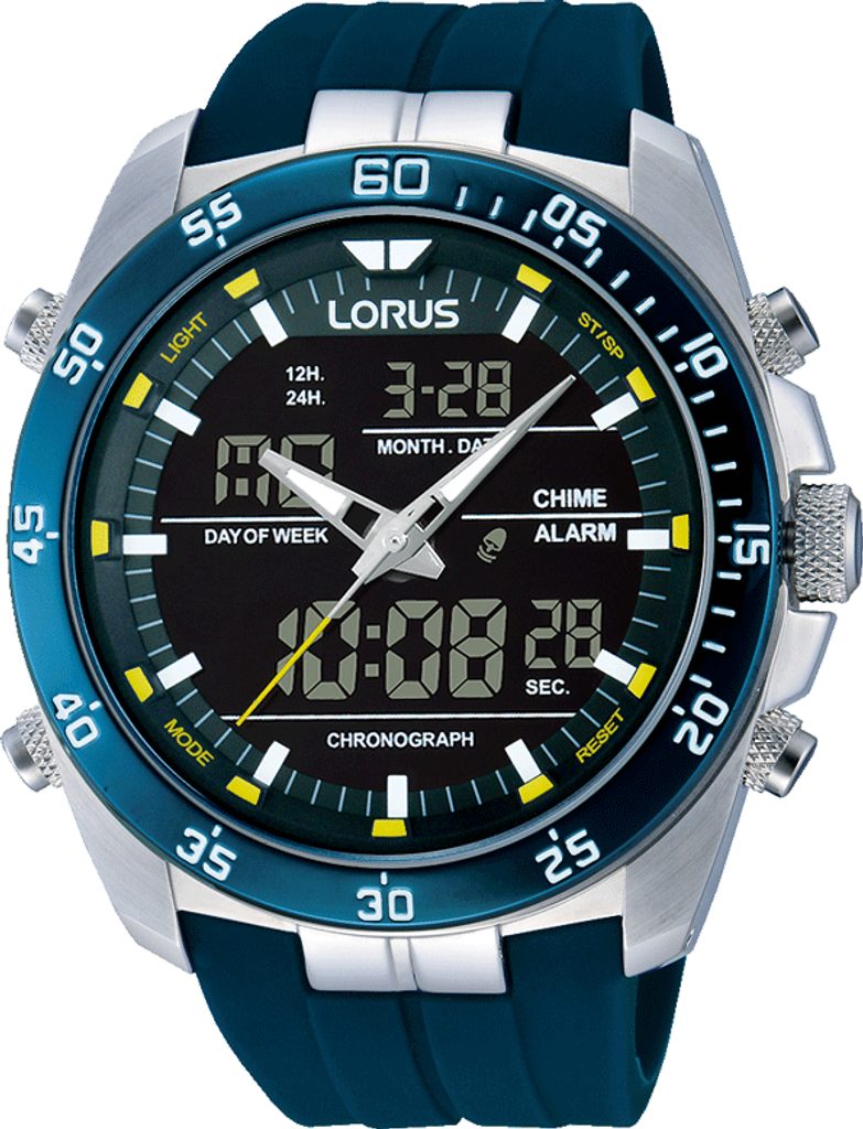 Pánské hodinky Lorus, značky firmy SEIKO. Model vhodný k běžnému nošení, či sportovním aktivitám, je vyroben v kombinaci ocelového pouzdra a uretanového řemínku. Černý ciferník, jenž kombinuje analogové a digitální zobrazení času, chrání minerální sklíčko. Vodotěsnost hodinek je 100M - vhodné pro běžné koupání. Z funkcí hodinek nabízí model Lorus RW617AX9 ukazatel datum, stopky a budík. Hodinky disponují bateriovým strojkem quartz.