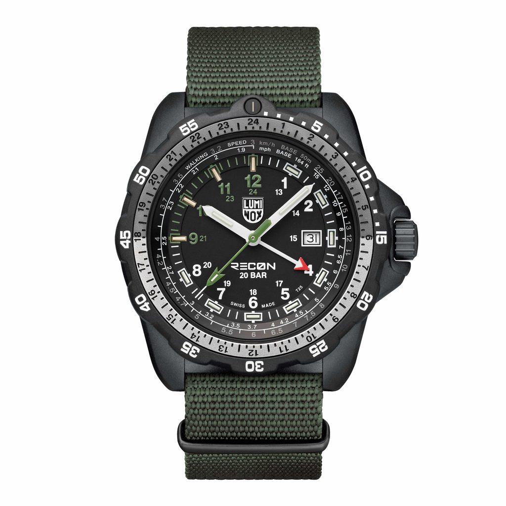 Ciferník chrání safírové sklíčko s antireflexní vrstvou a hodinky jsou vodotěsné do 200 metrů. V chod je uvádí švýcarský quartzový strojek GMT RONDA 515.24H umožňují sledovat dvě časová pásma současně, což je ideální pro mezinárodní cesty. Černý řemínek z odolné pryže obsahuje integrované mapové stupnice, pravítko a navíc odnímatelný kompas, čímž se hodinky mění v kompletní navigační přístroj. Tento set hodinek se dodává s přídavným zeleným NATO řemínkem pro větší všestrannost. Díky technologii Luminox Light zůstávají hodinky viditelné za všech světelných podmínek a jejich stálý svit vydrží až 25 let.