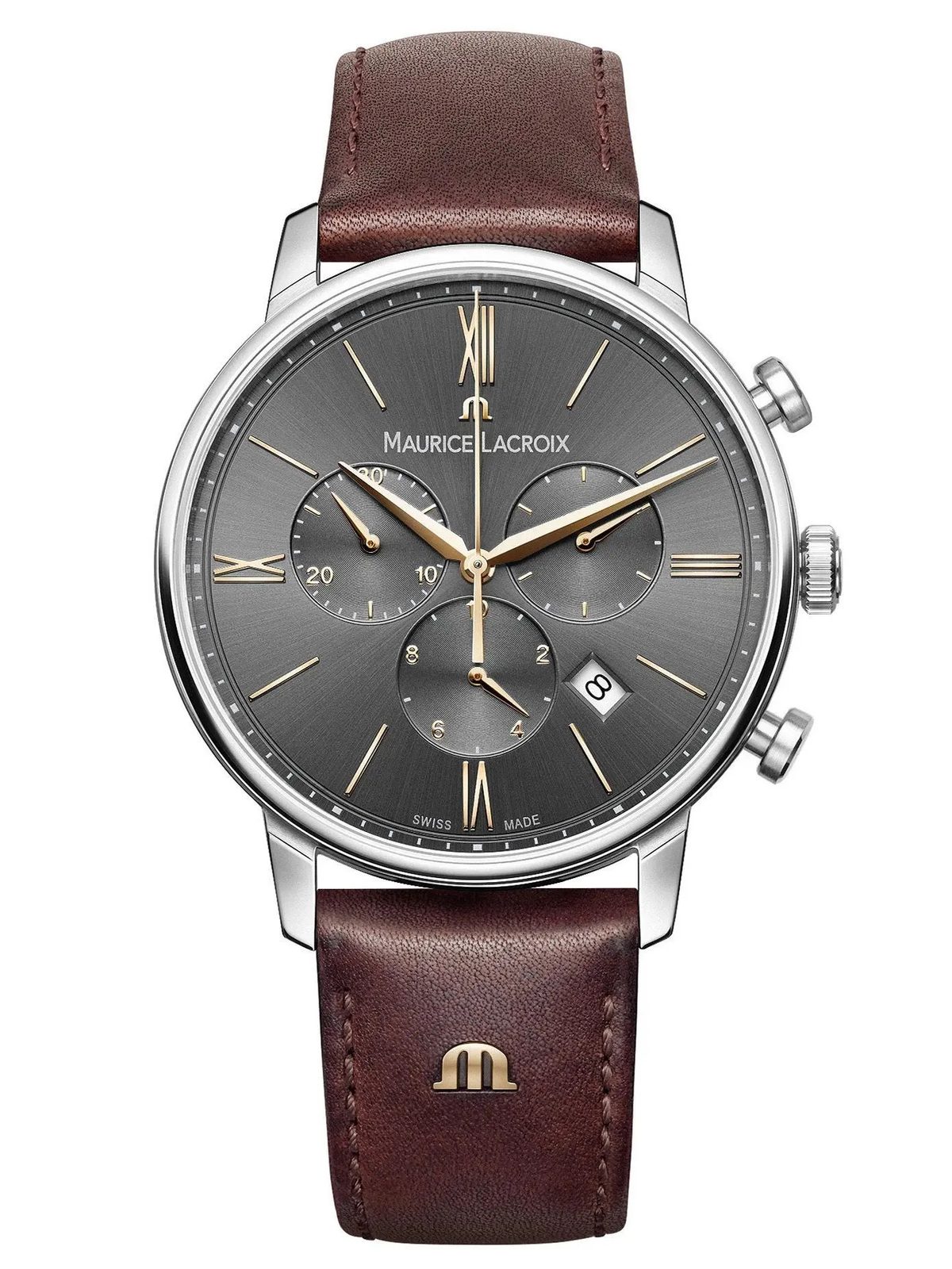 Hodinky Maurice Lacroix Eliros Chronograph EL1098-SS001-311-1 mají pouzdro vyrobené z ušlechtilé oceli, které je doplněno hnědým řemínkem z telecí kůže. V jeho nitru spolehlivě tiká švýcarský bateriový strojek Ronda 5040.D. Strojek disponuje ukazatelem data, které najdeme mezi indexy čtyři a pět. Hodinky mají i praktickou funkci stopek s možností měření až do 30 minut.