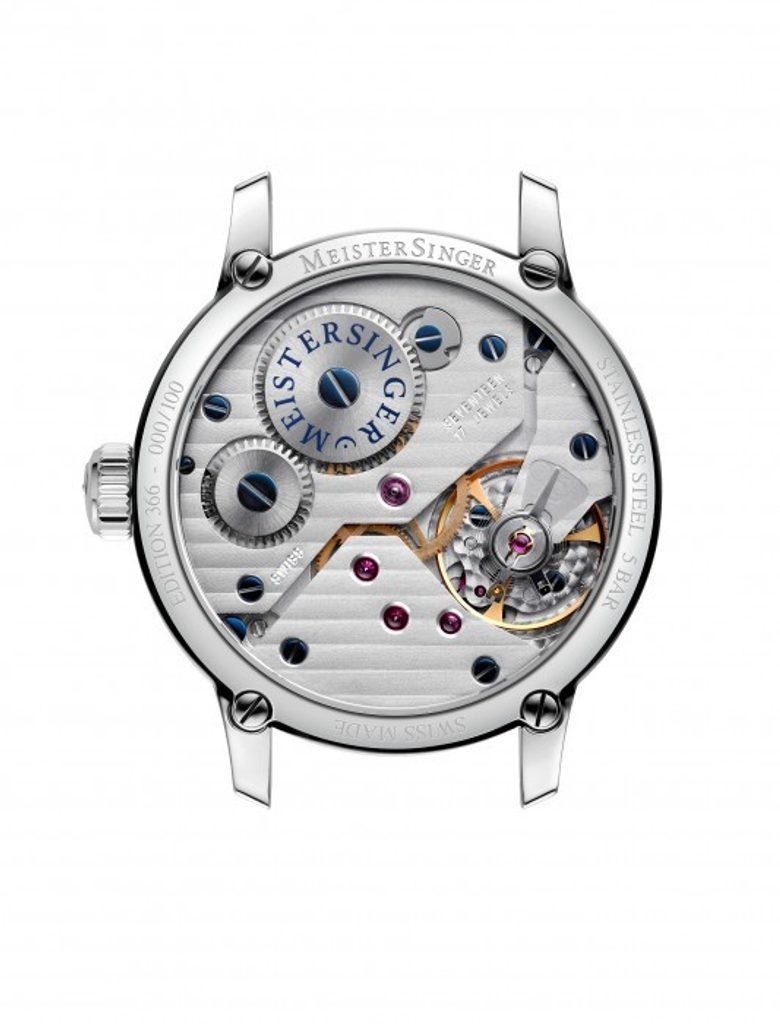 Pouzdro hodinek MeisterSinger Edition 366 je vyrobeno z ušlechtilé oceli a v jeho nitru tiká švýcarský mechanický strojek Unitas 6498-1 s 19 kameny a manuálním nátahem. Tento strojek pracuje na frekvenci 18000 polokmitů za hodinu a jeho rezerva nátahu činí až 46 hodin. Tento krásně zdobený strojek můžete sledovat přes průhledné dýnko hodinek.