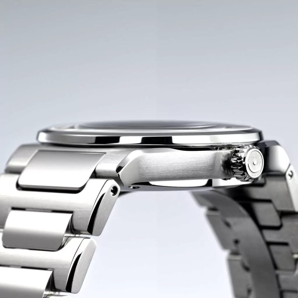 Pouzdro hodinek o průměru 40 mm je vyrobeno z ušlechtilé oceli, přičemž kombinuje částečně leštěné a částečně kartáčované plochy, což dodává jeho tělu obzvláště elegantní a živý vzhled.