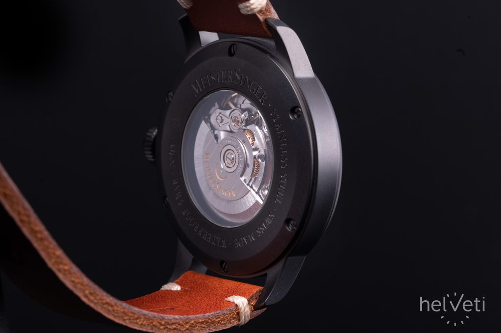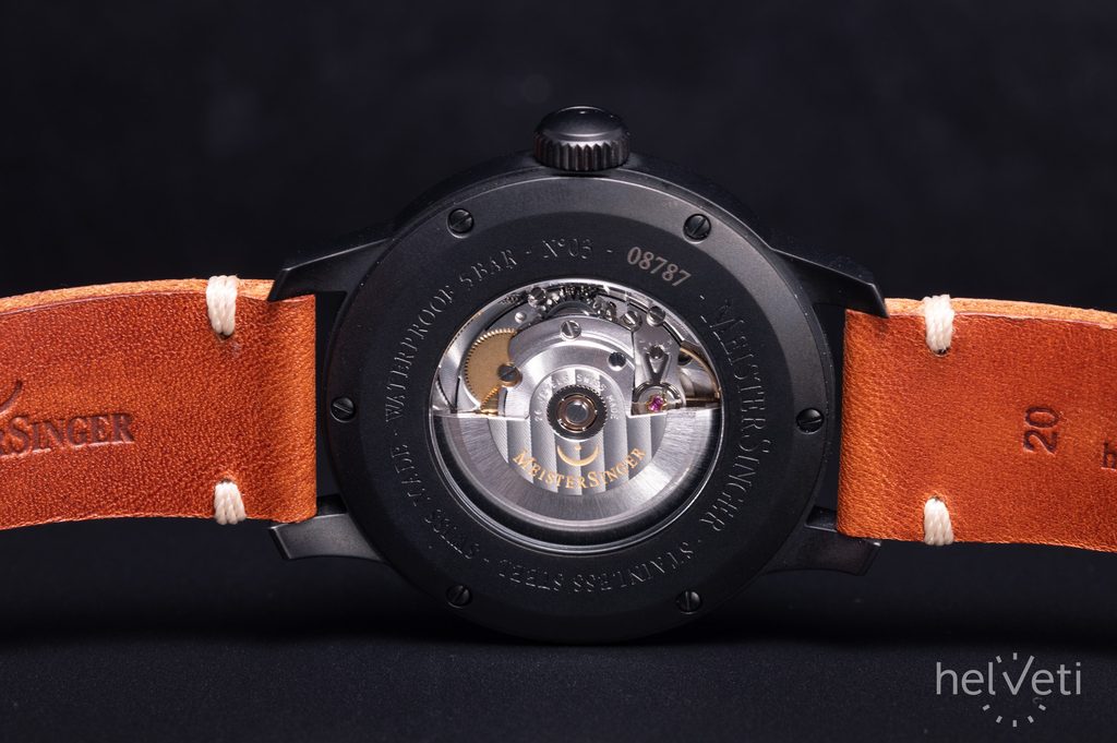 Pouzdro hodinek MeisterSinger N°03 Black Line AM902BL je vyrobeno z ušlechtilé oceli s černou DLC úpravou, která je vysoce odolná vůči poškrábání. V jeho nitru tiká švýcarský mechanický strojek ETA 2824-2 nebo Sellita SW 200-1 s automatickým nátahem. Tento zdobený strojek, pracující na frekvenci 28800 polokmitů za hodinu, lze pozorovat díky průhlednému dýnku. Číselník má, stejně jako celý model, lehký retro nádech a samozřejmostí je jeho výborné zpracování. Díky typické minutové stupnici se můžete spolehnout na dokonalou přehlednost i přesto, že je čas zobrazen pouze jednou ručkou.