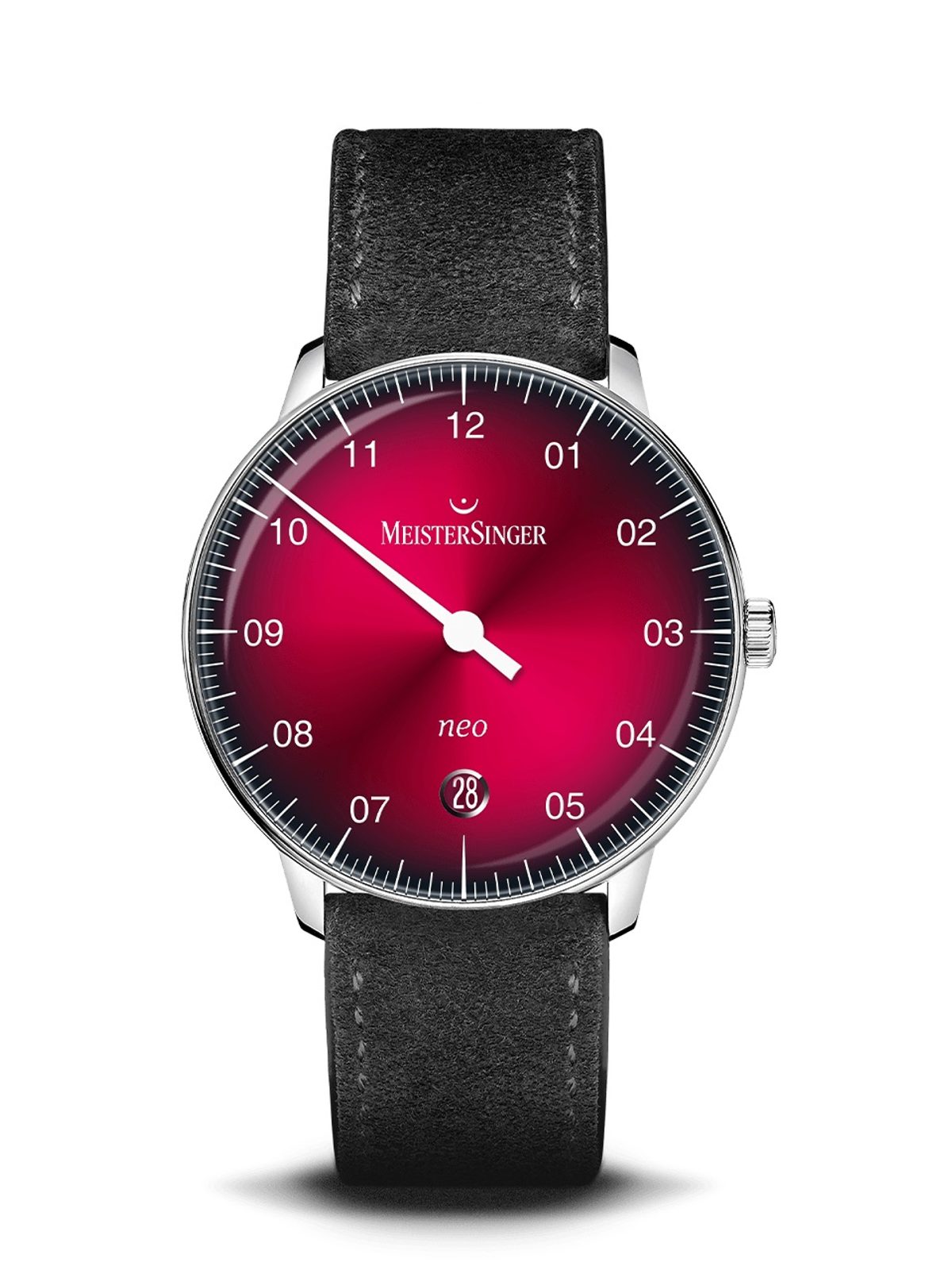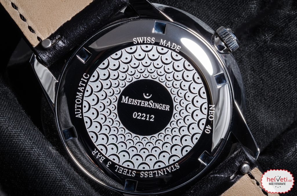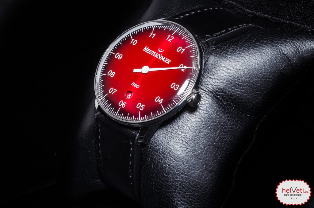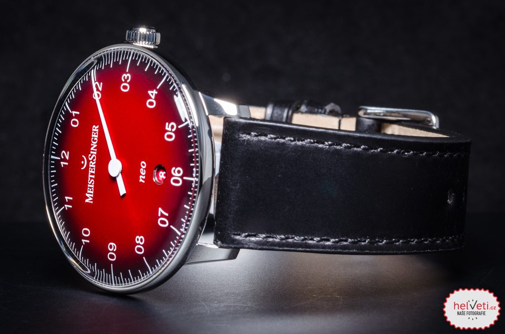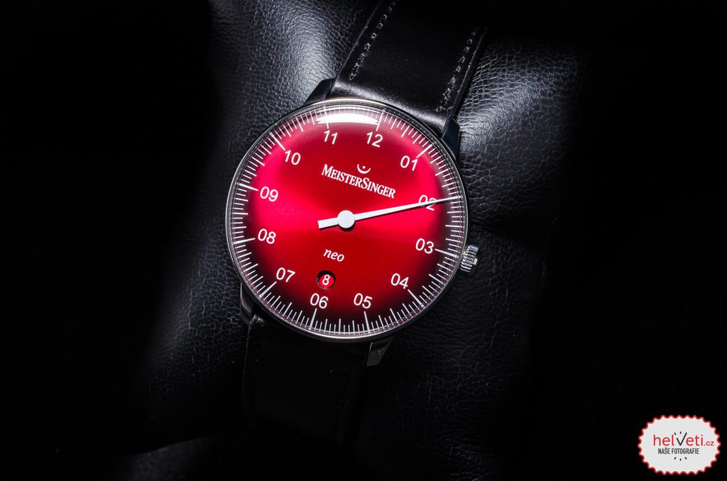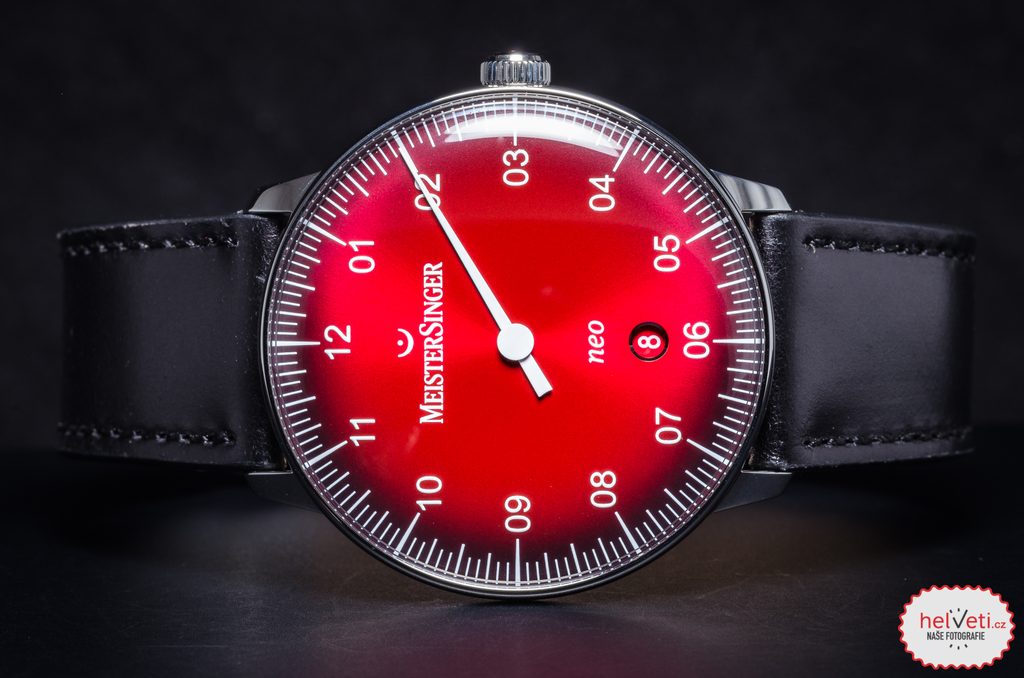Pouzdro hodinek MeisterSinger Neo Plus NE411D je vyrobeno z ušlechtilé oceli a v jeho nitru tiká švýcarský mechanický strojek Sellita SW 200-1 s automatickým nátahem. Na pozici 6 pak najdeme nenápadný, ale praktický ukazatel data. Číselník má, stejně jako celý model, lehký retro nádech, u tohoto modelu konkrétně najdeme inspiraci z 50. let a samozřejmostí je jeho výborné zpracování. Díky typické minutové stupnici se můžete spolehnout na dokonalou přehlednost i přesto, že je čas zobrazen pouze jednou ručkou. Číselník má vínově rudou barvu, která ke krajům přechází do černé. Odstín červené se mění podle dopadajícího světla.