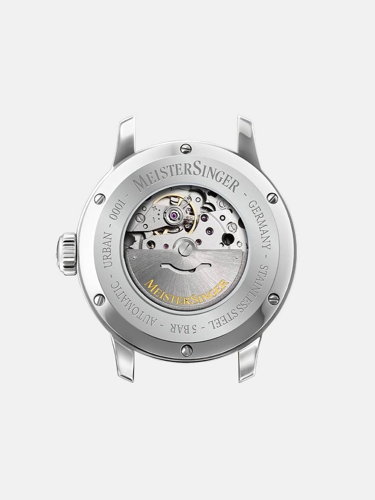 Pouzdro hodinek MeisterSinger Urban Day Date URDD902 je vyrobeno z ušlechtilé oceli a v jeho nitru tiká japonský mechanický strojek Miyota 8285 s automatickým nátahem. Tento zdobený strojek, pracující na frekvenci 21600 polokmitů za hodinu, lze pozorovat díky průhlednému dýnku. Na pozici 6 poslouží praktický ukazatel data, na pozici 12 pak najdeme ukazatel dne v týdnu, zobrazený celým slovem. Číselník má, stejně jako celý model, lehký retro nádech a samozřejmostí je jeho výborné zpracování. Díky typické minutové stupnici se můžete spolehnout na dokonalou přehlednost i přesto, že je čas zobrazen pouze jednou ručkou.