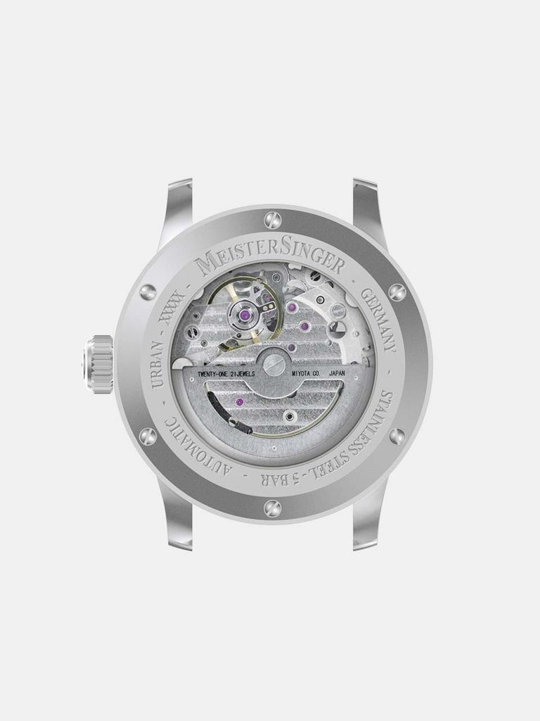 Pouzdro hodinek MeisterSinger Urban UR913 je vyrobeno z ušlechtilé oceli a v jeho nitru tiká japonský mechanický strojek Miyota 8245 s automatickým nátahem. Tento zdobený strojek, pracující na frekvenci 21600 polokmitů za hodinu, lze pozorovat díky průhlednému dýnku. Číselník má, stejně jako celý model, lehký retro nádech a samozřejmostí je jeho výborné zpracování. Díky typické minutové stupnici se můžete spolehnout na dokonalou přehlednost i přesto, že je čas zobrazen pouze jednou ručkou.
