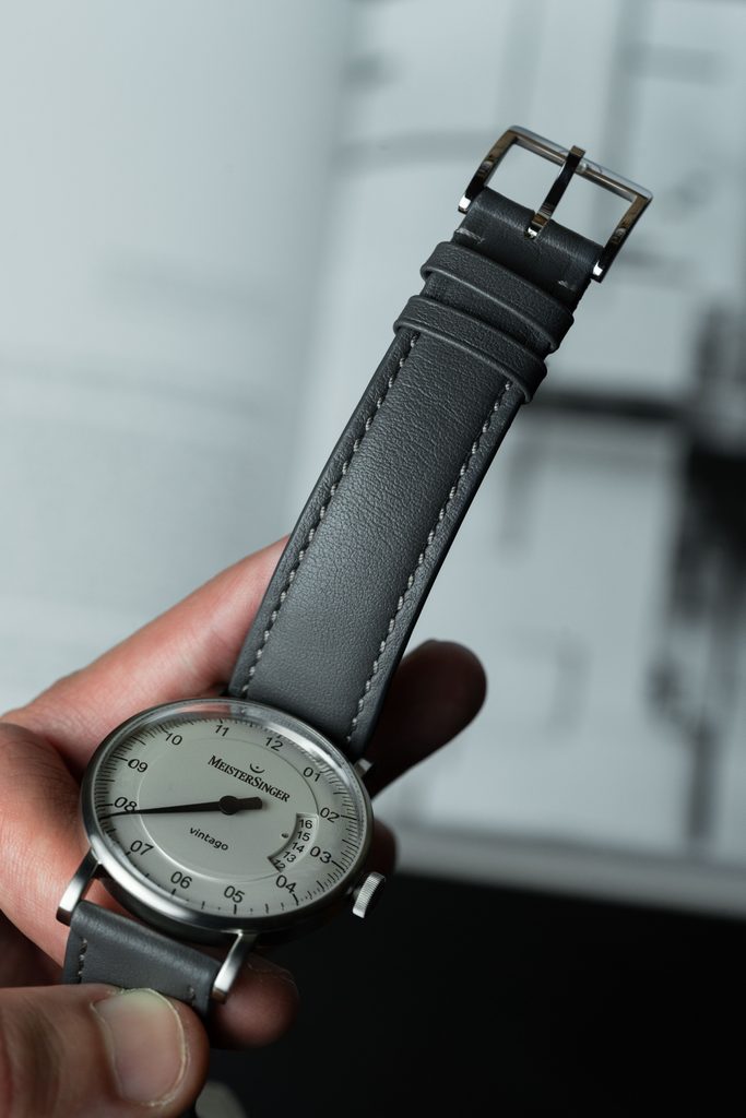 Pouzdro hodinek MeisterSinger Vintago VT901 je vyrobeno z ušlechtilé oceli a v jeho nitru tiká švýcarský mechanický strojek Sellita SW 200-1 s 26 kameny a automatickým nátahem. Tento zdobený strojek, pracující na frekvenci 28800 polokmitů za hodinu, lze pozorovat díky průhlednému dýnku. Na pozici 3 se nachází ukazatel data, který je zobrazen částečně odhaleným diskem. Číselník má, stejně jako celý model, lehký retro nádech a samozřejmostí je jeho výborné zpracování. Díky typické minutové stupnici se můžete spolehnout na dokonalou přehlednost i přesto, že je čas zobrazen pouze jednou ručkou.