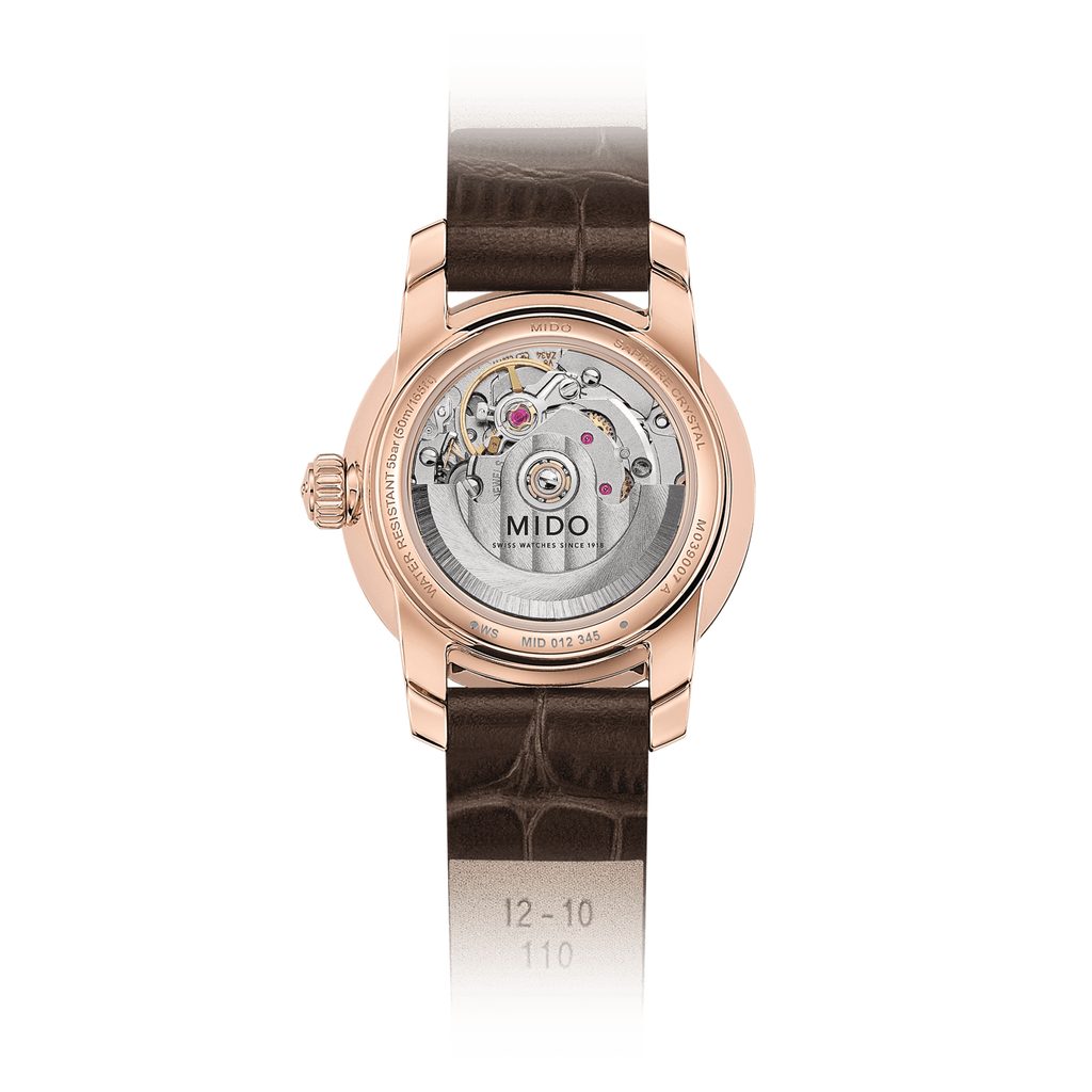 Hodinky Mido M039.007.36.076.00 mají pouzdro vyrobené z ušlechtilé oceli 316L s PVD úpravou v barvě z růžového zlata, které je vkusně doplněno koženým řemínkem. V něm spolehlivě tiká švýcarský mechanický strojek Mido Caliber 48 (základem je ETA C26.111) s automatickým nátahem. Ten pracuje na frekvenci 28800 polokmitů za hodinu, disponuje 24 kameny a rezervou chodu 48 hodin. Činnost tohoto strojku lze pozorovat průhledným dýnkem. Na pozici 3. hodiny najdeme praktický ukazatel data.