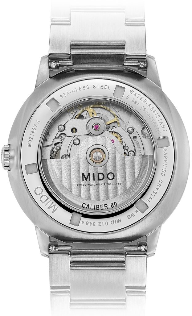 Hodinky Mido M021.407.11.411.03 mají pouzdro včetně náramku vyrobené z ušlechtilé oceli 316L. V něm spolehlivě tiká švýcarský mechanický strojek Caliber 80 (základem je ETA C07.611) s automatickým nátahem. Ten pracuje na frekvenci 21600 polokmitů za hodinu, disponuje 25 kameny a především prodlouženou rezervou chodu 80 hodin. Činnost tohoto strojku lze pozorovat průhledným dýnkem a také průhledným číselníkem. Na pozici 3. hodiny najdeme praktický ukazatel data.