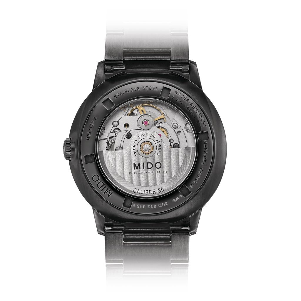 Hodinky Mido M021.407.33.411.00 mají pouzdro včetně náramku vyrobené z ušlechtilé oceli 316L s PVD úpravou. V něm spolehlivě tiká švýcarský mechanický strojek Caliber 80 (základem je ETA C07.611) s automatickým nátahem. Ten pracuje na frekvenci 21600 polokmitů za hodinu, disponuje 25 kameny a především prodlouženou rezervou chodu 80 hodin. Činnost tohoto strojku lze pozorovat průhledným dýnkem a také průhledným číselníkem. Na pozici 3. hodiny najdeme praktický ukazatel data.