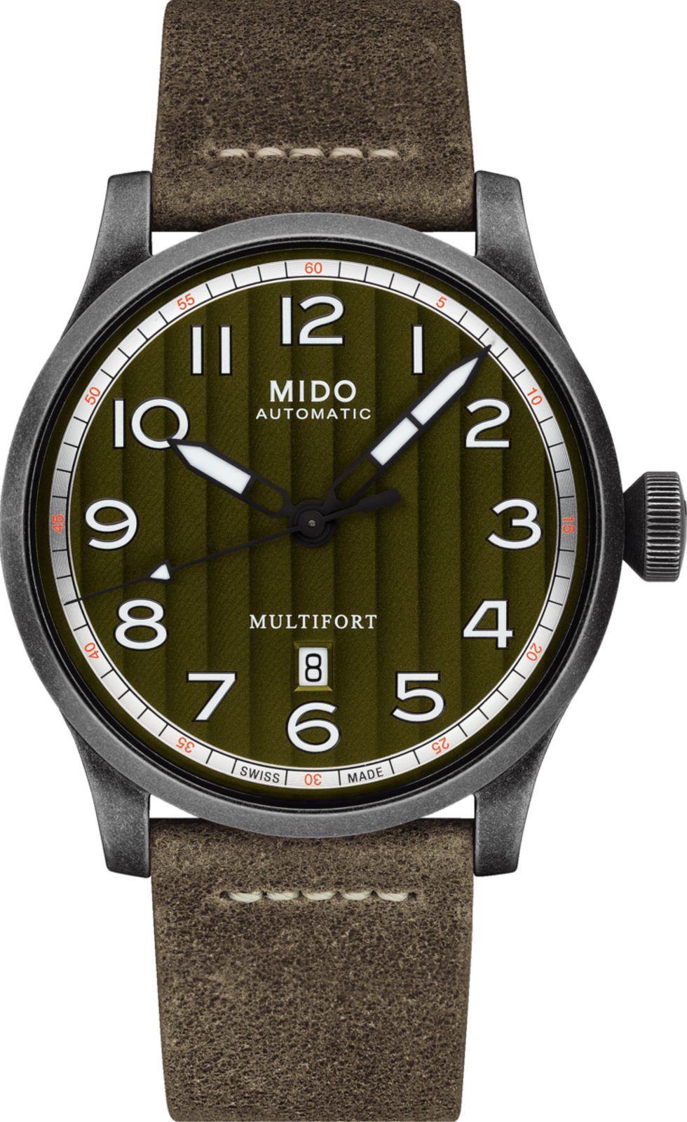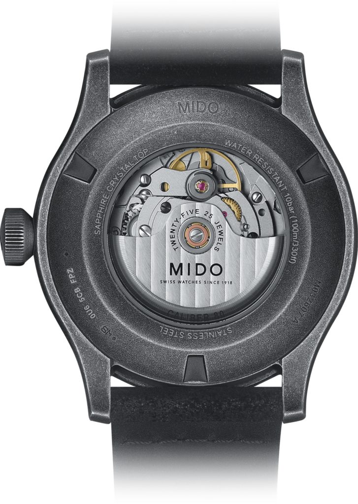 Hodinky Mido M032.607.36.090.00 mají pouzdro vyrobené z ušlechtilé oceli 316L s PVD úpravou (s vytvořenou patinou), které doplňuje kožený řemínek. V pouzdře spolehlivě tiká švýcarský mechanický strojek Mido Caliber 80 (základem je ETA C07.611) s automatickým nátahem. Ten pracuje na frekvenci 21600 polokmitů za hodinu, disponuje 25 kameny a především prodlouženou rezervou chodu 80 hodin. Činnost tohoto strojku lze pozorovat průhledným dýnkem. Na pozici 6. hodiny najdeme praktický ukazatel data a dne v týdnu.