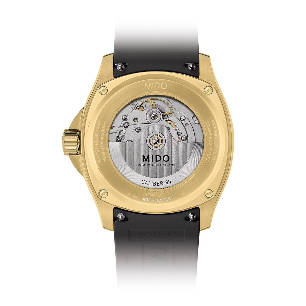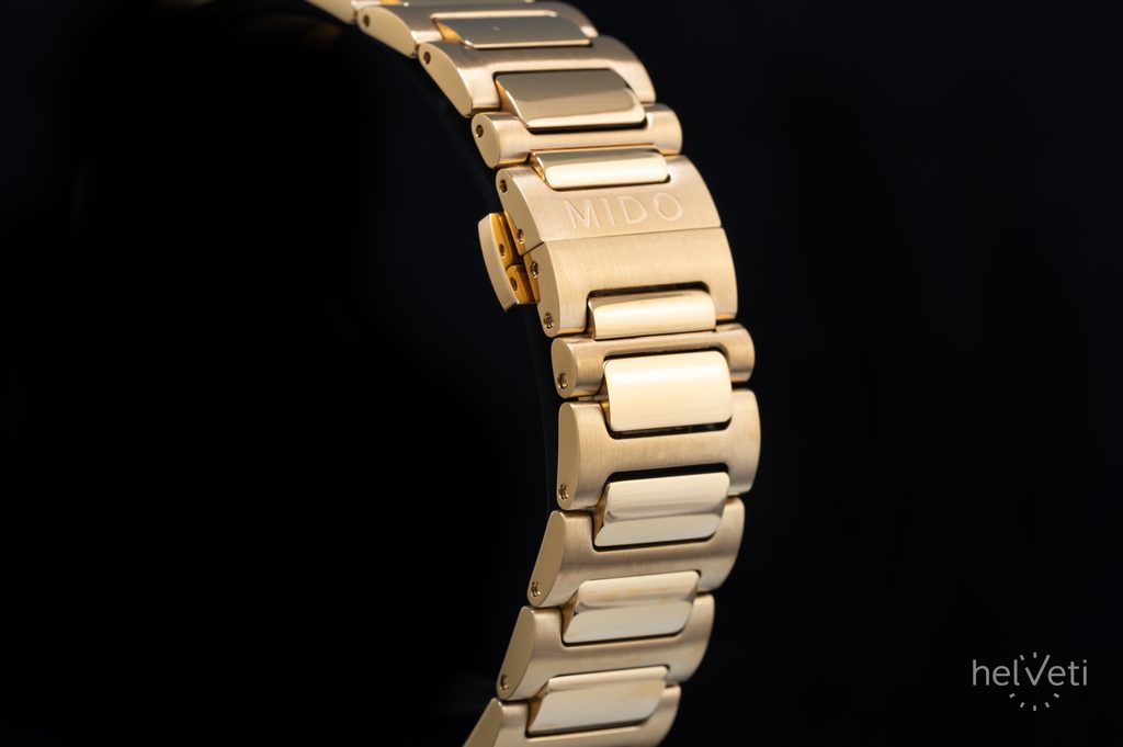 Hodinky Mido M049.526.33.021.00 mají pouzdro včetně náramku vyrobené z ušlechtilé oceli 316L s PVD úpravou zlaté barvy. Součástí balení je také pryžový řemínek navíc. Náramek i řemínek disponují rychlostěžejkami a proto je možná jejich snadná výměna bez pomoci nástrojů. V pouzdře spolehlivě tiká švýcarský mechanický strojek Caliber 80 Big Date (základem je ETA C07.651) s automatickým nátahem. Ten pracuje na frekvenci 21600 polokmitů za hodinu, disponuje 25 kameny a především prodlouženou rezervou chodu 80 hodin. Činnost tohoto strojku lze pozorovat průhledným dýnkem. Na pozici 12. hodiny najdeme praktický velký ukazatel data - tzv. Big Date.
