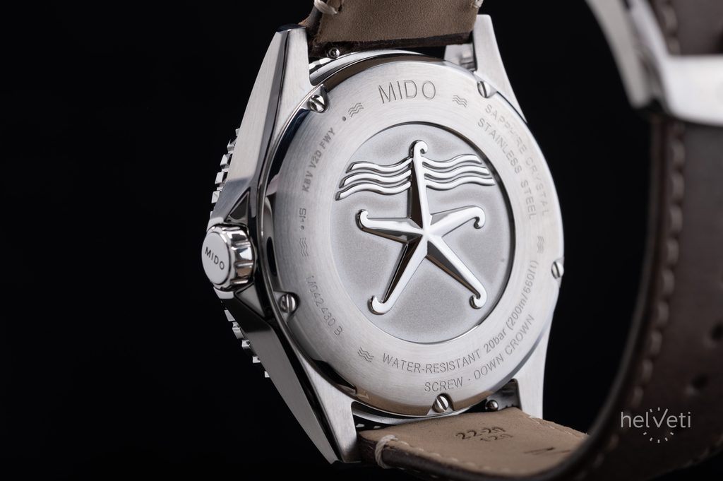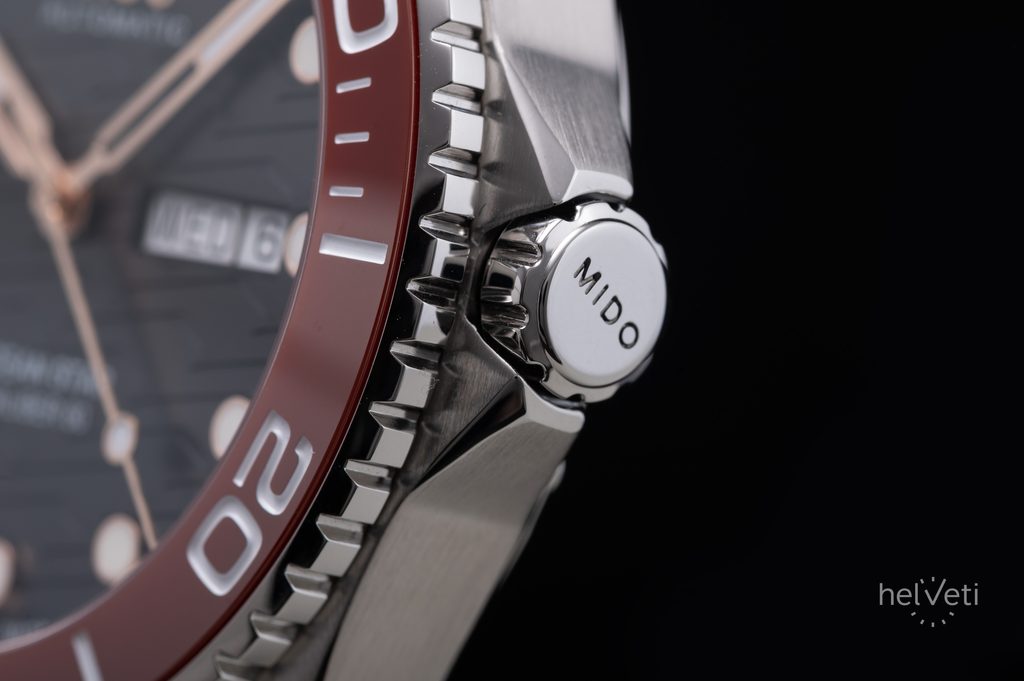 Hodinky Mido M042.430.16.051.00 mají pouzdro vyrobené z ušlechtilé oceli 316L a doplňuje je kožený řemínek. V pouzdře spolehlivě tiká švýcarský mechanický strojek Caliber 80 (základem je ETA C07.621) s automatickým nátahem. Ten pracuje na frekvenci 21600 polokmitů za hodinu, disponuje 25 kameny a především prodlouženou rezervou chodu 80 hodin. Na pozici 3. hodiny najdeme praktický ukazatel data a dne v týdnu. K měření časových úseků lze využít jednosměrně otočnou keramickou potápěčskou lunetu.