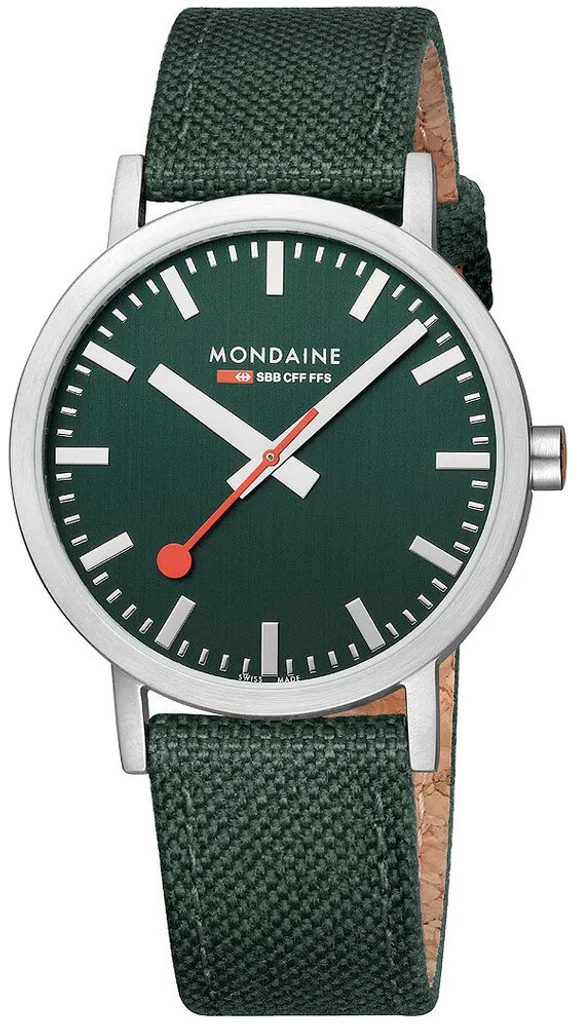 Velmi přehledný zelený číselník je chráněn tvrzeným minerálním sklíčkem. Nezaměnitelným symbolem je pro značku Mondaine červená vteřinová ručka.