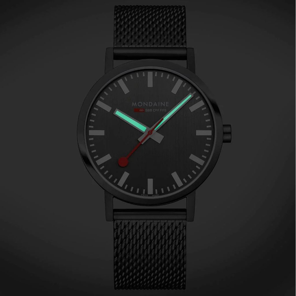 Mondaine Classic Quartz A660.30360.81SBM zůstává věrný designovému jazyku oficiálních hodin Švýcarských železnic a zároveň přináší hlubší, více architektonický tón. Antracitový číselník vytváří rafinovaný kontrast s výraznými hodinovými a minutovými indexy a ikonickou červenou sekundovou ručkou, čímž zachovává vysokou čitelnost, která charakterizuje designové dědictví značky MONDAINE. Pro zvýšenou funkčnost ručky disponují technologií Super-LumiNova®, která zajišťuje jasnou čitelnost v podmínkách slabého osvětlení.