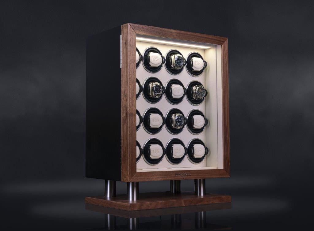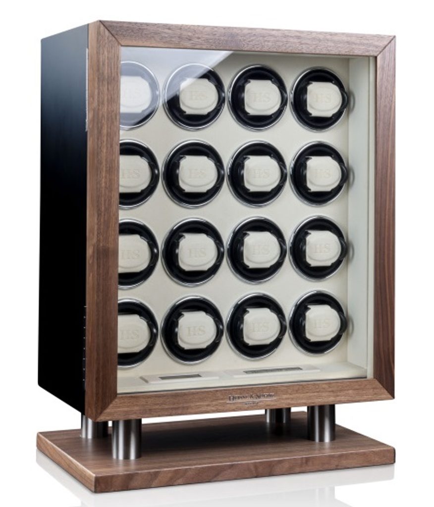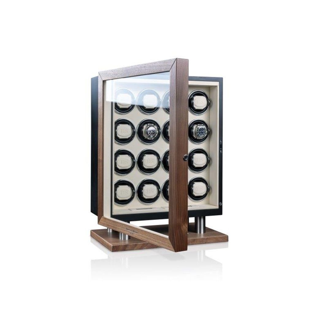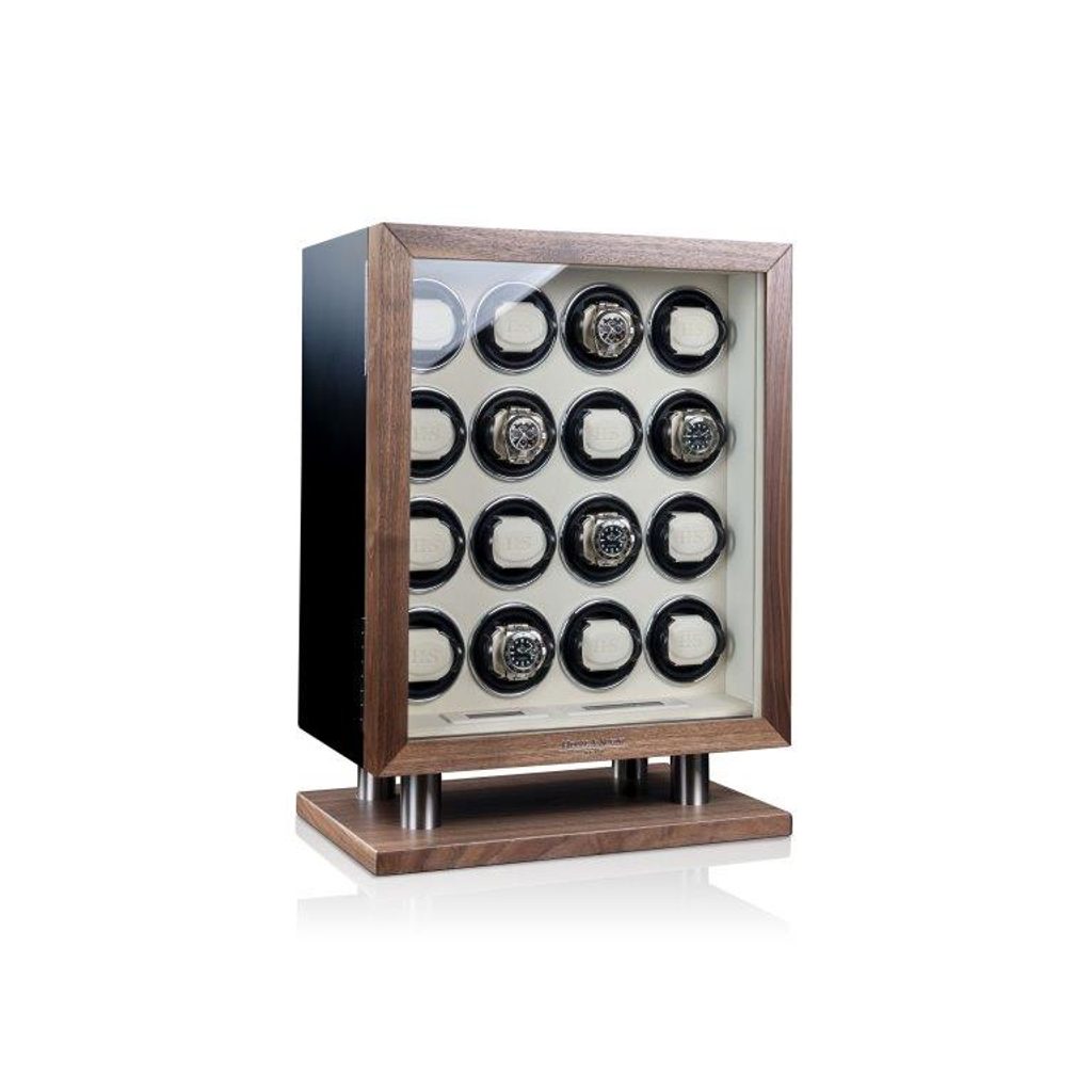 Natahovač Heisse & Söhne New York Collector 16 70019-237.142 pro 16 kusů mechanických hodinek s automatickým nátahem. Natahovače hodinek řady New York jsou předurčeny k bezpečnému a stylovému uložení. Kombinace amerického ořechu a matného laku dodává této řadě jednoduchou eleganci. Kartáčované a eloxované aplikace hliníku v podstavci jsou vysoce expresivními prvky této řady. Tento krásný model splňuje nejvyšší stardardy ohledně nové technologie a designu. Tělo natahovače je vyrobeno ze dřeva, dvířka jsou opatřena minerálním sklem.