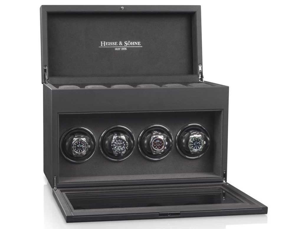 Natahovač Heisse & Söhne Vancouver 4 70019-205.142.50 černé barvy, pro 4 kusy mechanických hodinek s automatickým nátahem. Pod horním víkem najdeme úložní prostor pro dalších šest hodinek. Měkké polštářky na hodinky v horním oddíle jsou na obou stranách opatřeny pochromovanými vodicími kolíky, které zabraňují sklouznutí hodinek. Natahovač je potažený hnědou kvalitní imitací kůže s interiérem v hnědé barvě.