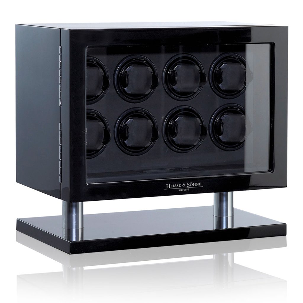 Natahovač Heisse & Söhne Collector 8 LCD 70019-73 černé barvy, pro 8 kusů mechanických hodinek s automatickým nátahem. Vyrobeno ručně ze dřeva, na kterém je naneseno 10 vrstev laku ve vysokém piano lesku. Ovládání probíhá prostřednictvím LCD displeje a každý z osmi rotorů lze nastavit samostatně dle potřeb vašich hodinek. Vnitřek natahovače je z veluru a disponuje LED osvětlením. Průhled je prosklený a dvířka uzamykatelná. Díky různým režimům otáčení je vhodný téměř pro všechny běžné hodinky s automatickým nátahem.
