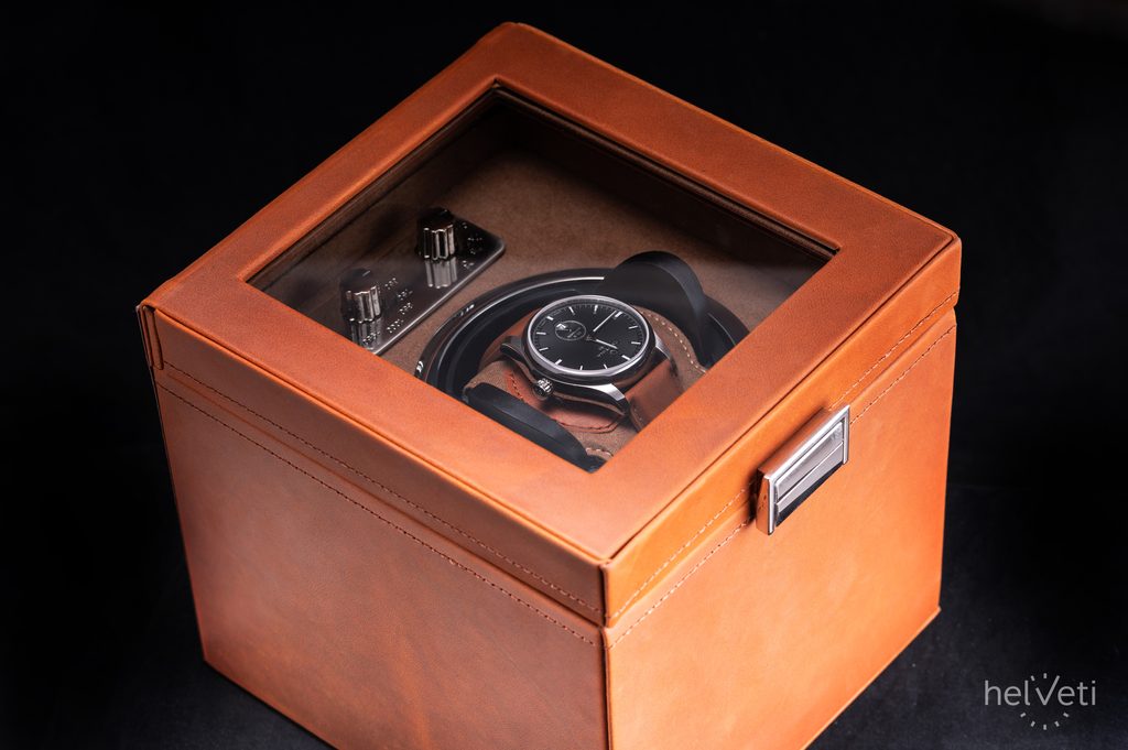 Natahovač Helveti černý pro 1 kus mechanických hodinek s automatickým nátahem. Potažen je tmavě hnědou strukturovanou pravou kůží, vnitřek je vystlán měkkým tmavě hnědým velurem. Hodinky můžete sledovat pomocí průhledného víka.