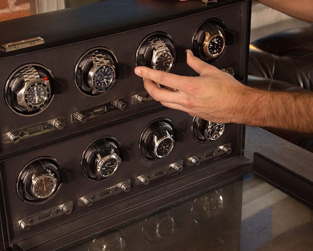 Natahovač Wolf Viceroy 456902 potaženo kvalitní veganskou kůží, pro 8 kusů mechanických hodinek s automatickým nátahem. Nový design „uzamkne“ manžetu do bubnu rotátoru pro bezpečné uchycení. Polštářek z pěny z nízkou hustotou se snadno přizpůsobí jakémukoliv obvodu hodinek bez toho, aniž by vyvíjel nadbytečný tlak na sponu. Součástí natahovače je i úložní prostor pro pět dalších hodinek a cestovní pouzdro.