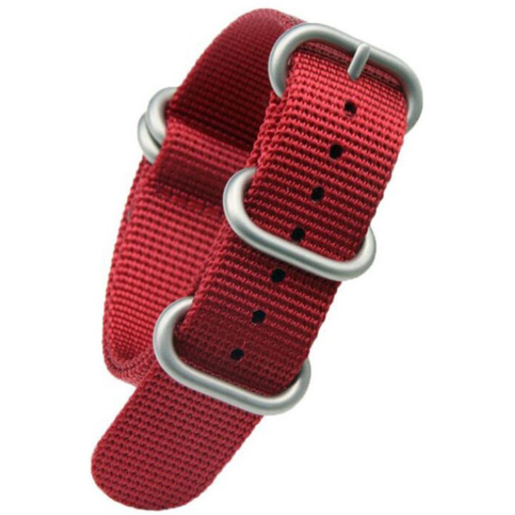 Hrubý a odolný nylonový ZULU řemínek se liší od Nato hrubší tkaninou a zesílenou konstrukcí kovového zapínání, které je z pískované nerez oceli. V šířce 20 mm, 22 mm nebo 24 mm z nylonového materiálu v červené barvě.