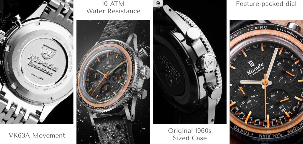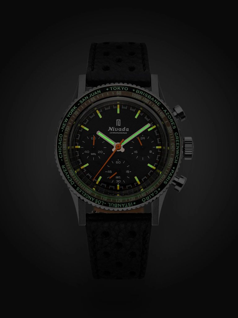 Pro toto vydání se Nivada Grenchen inspirovala svým legendárním modelem Chronomaster a vytvořila novou verzi, která vychází z vintage ciferníku Chronoking přímo z divokých a nádherných sedmdesátých let. Původně subciferníky ve stylu „Singer Newman“ byly umístěny na tonneau pouzdru s kalibrem Valjoux 72 a za tímto velmi speciálním ciferníkem se skrývalo velmi speciální jméno: Jean Singer, přední výrobce ciferníků sídlící v La Chaux-de-Fonds, známý svou výrobou některých z nejslavnějších a nejvíce sběratelských exotických ciferníků, jaké svět hodinářství kdy měl a stále má. Ciferníky jako výrazný Speedmaster Racing, energický Heuer Skipper nebo intenzivně modrý Nina od Universalu byly všechny vyrobeny právě tímto jediným a jedinečným Jeanem Singerem.