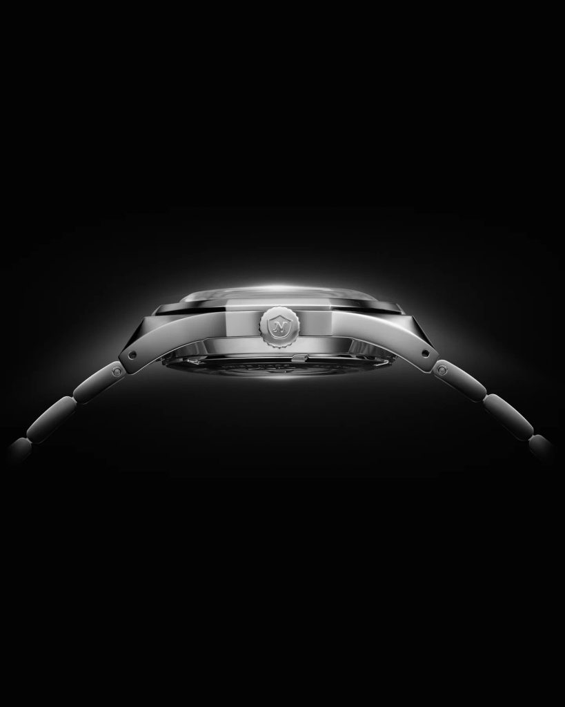 Celé pouzdro i náramek jsou vyrobeny z ušlechtilé oceli 316L, přičemž kombinace kartáčovaných a leštěných ploch zvýrazňuje čisté linie osmiúhelníkového tvaru a integrovaného náramku.