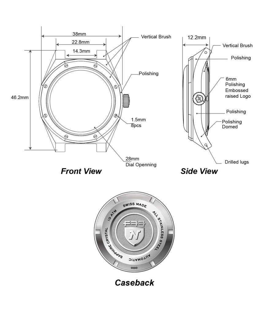 Celé pouzdro i náramek jsou vyrobeny z ušlechtilé oceli 316L, přičemž kombinace kartáčovaných a leštěných ploch zvýrazňuje čisté linie osmiúhelníkového tvaru a integrovaného náramku.